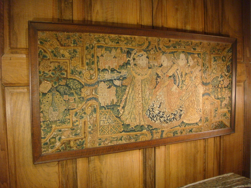 Bandeau de courtine en tapisserie fine aux petits points , à décor polychrome au centre d’une scène de cour , personnages dans un parc , architecture et château en arrière plan et sur les cotés deux réserves avec des animaux paon et licorne . Cette tapisserie présente des manques , anciennes restaurations et des anciens trous d’accrochage dans sa partie haute Elle est tendue sur un panneau de bois à encadrement de chêne postérieur. Angleterre . Ecosse époque fin XVI ème début XVII ème Siècle .