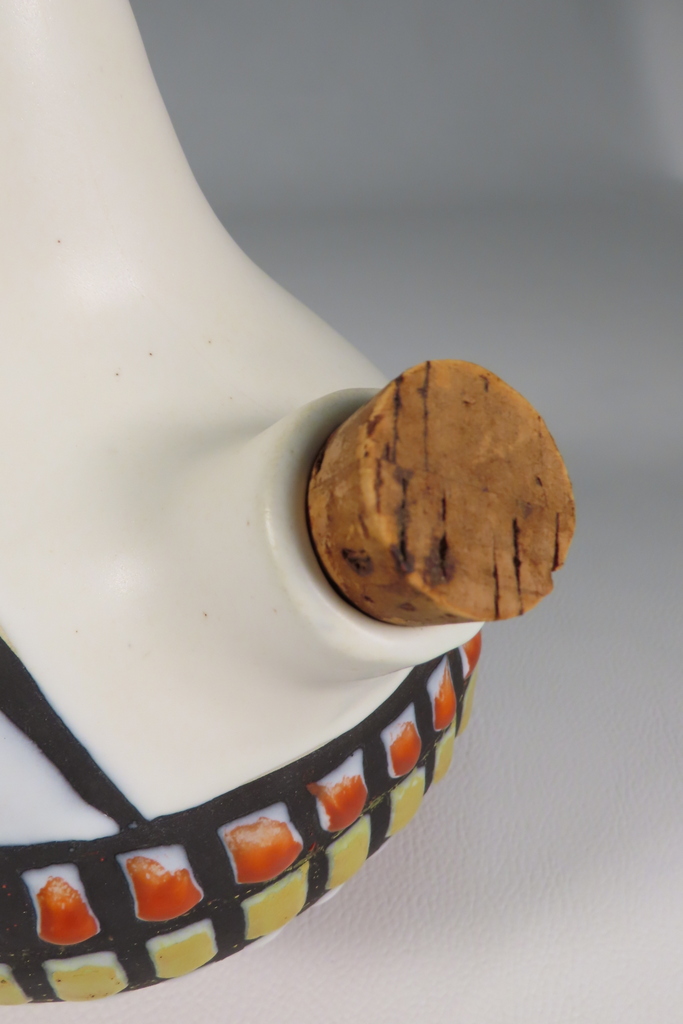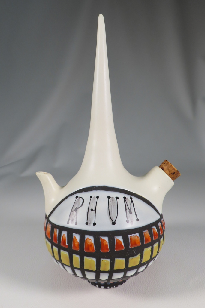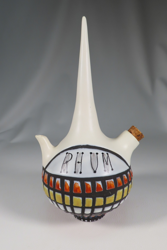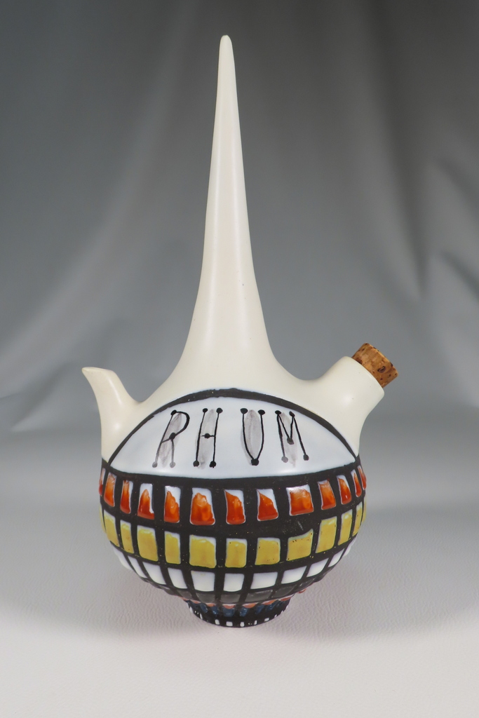 Bouteille à corps pansue à prise en pointe à bec verseur et remplissage agrémenté d’un bouchon de liège. Bouteille émaillée de petits carrés de couleur sur fond noir et crème, elle porte l’annotation Rhum. Cet objet est en parfait état. Présence de la signature en dessous Capron Vallauris et le numéro B 47