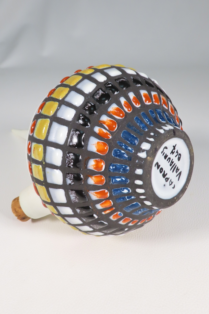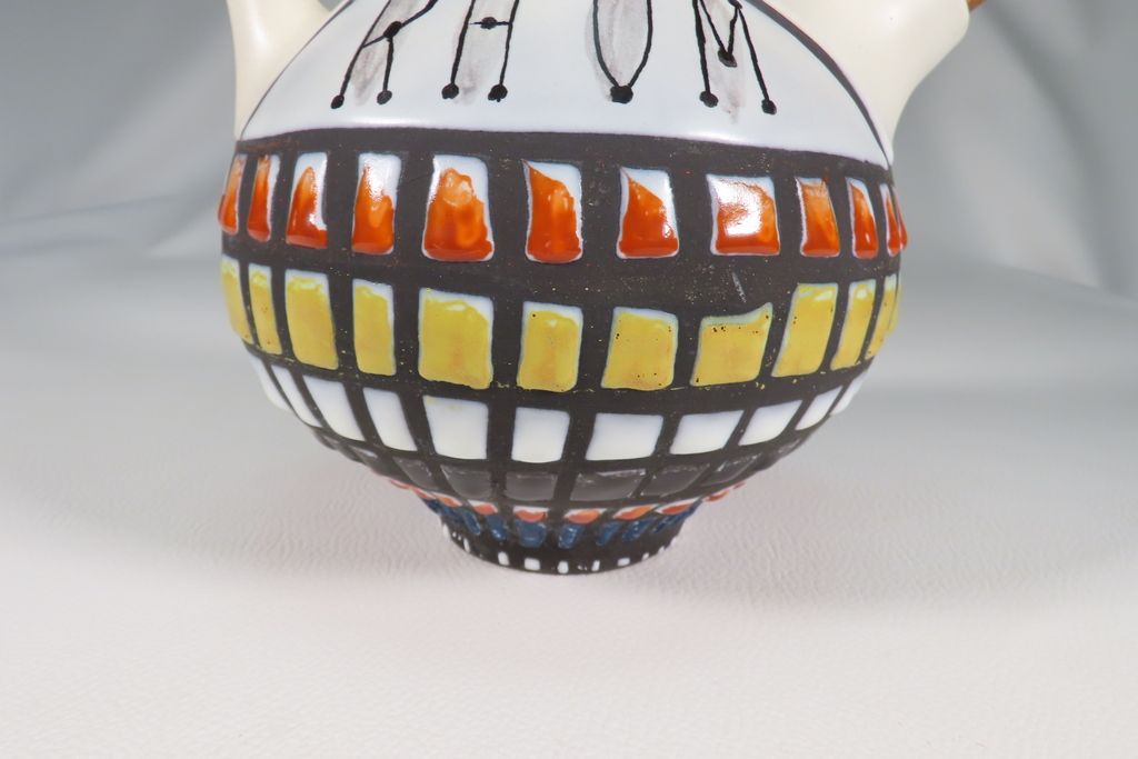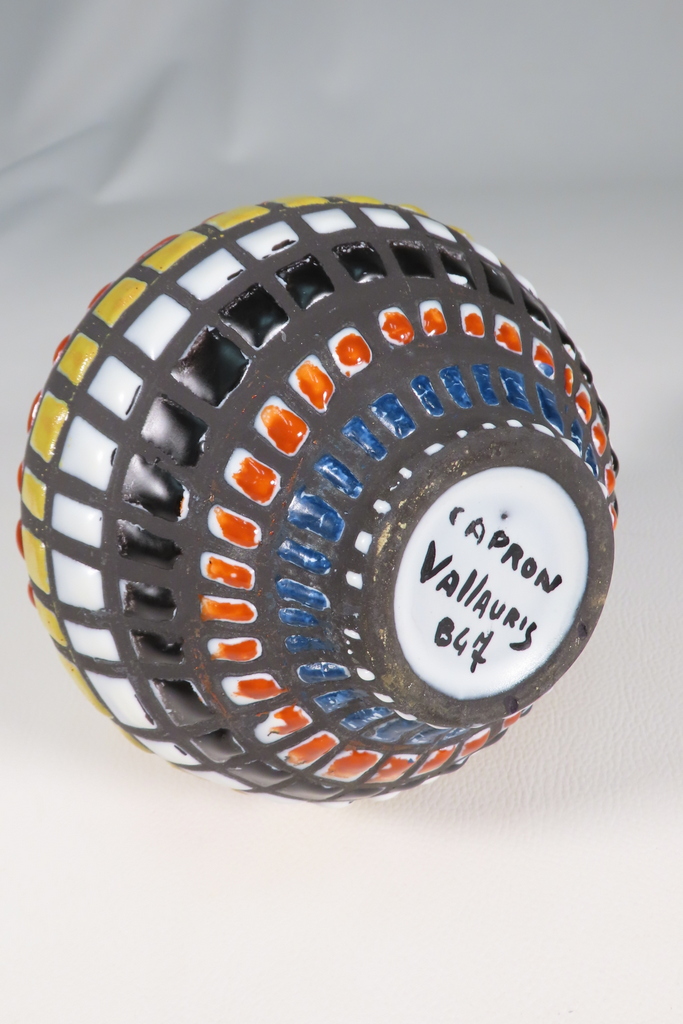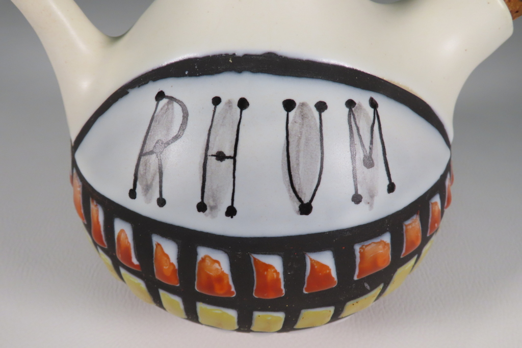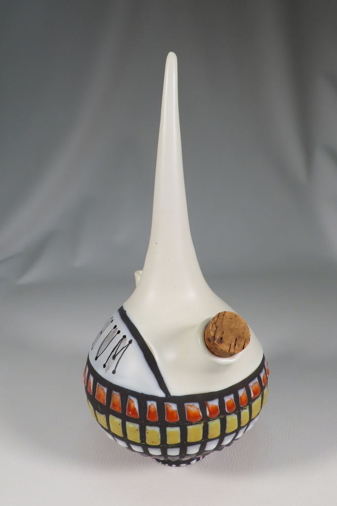 Bouteille à corps pansue à prise en pointe à bec verseur et remplissage agrémenté d’un bouchon de liège. Bouteille émaillée de petits carrés de couleur sur fond noir et crème, elle porte l’annotation Rhum. Cet objet est en parfait état. Présence de la signature en dessous Capron Vallauris et le numéro B 47