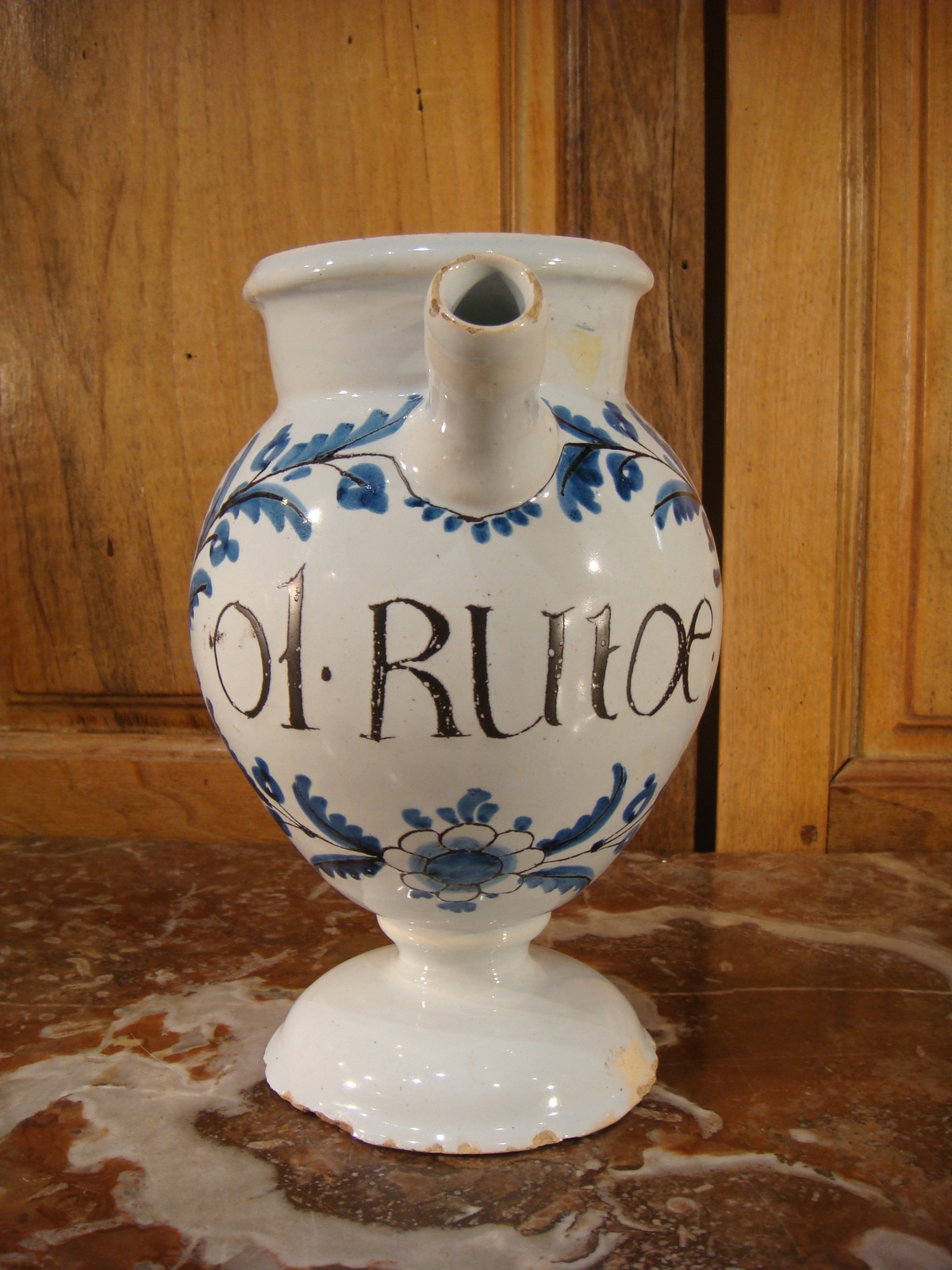 Chevrette d’Apothicaire sur piédouche en faïence émaillé à décor fleuri et feuillagé bleu portant l’annotation Ol. Rutoe. Cette chevrette est en bel état, elle présente quelques éclats et manques en pourtour du pied, visibles sur les photos. Faïence de Nevers Epoque XVIII ème Siècle.
