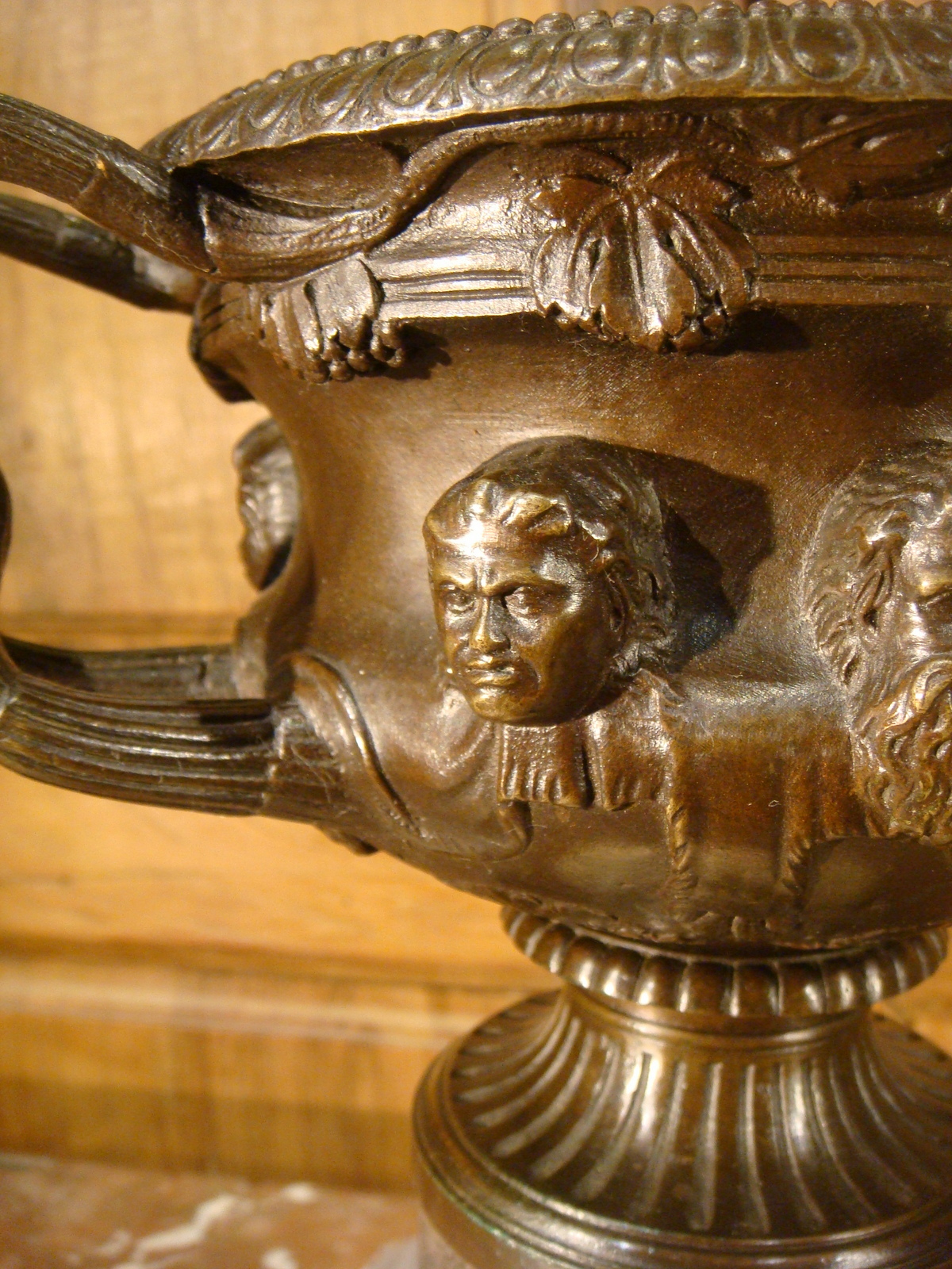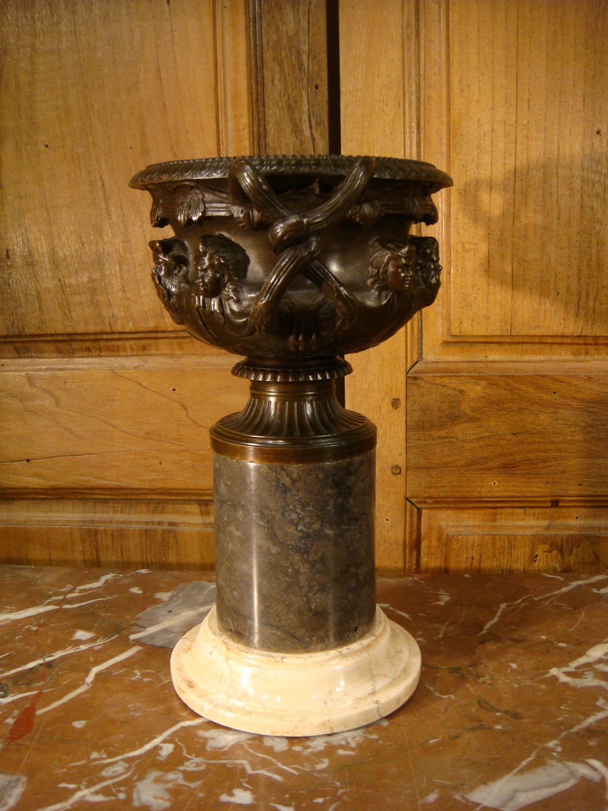 Coupe en cassolette en bronze à patine brune de style néo classique sur piédouche à cannelures, agrémentée de têtes Romaines en pourtour à décor de vignes et de prises en cèpes de vigne entremêlé. Elle est présentée sur une base en colonne en marbre gris et beige. Belle patine. Epoque deuxième partie du XIX ème Siècle.