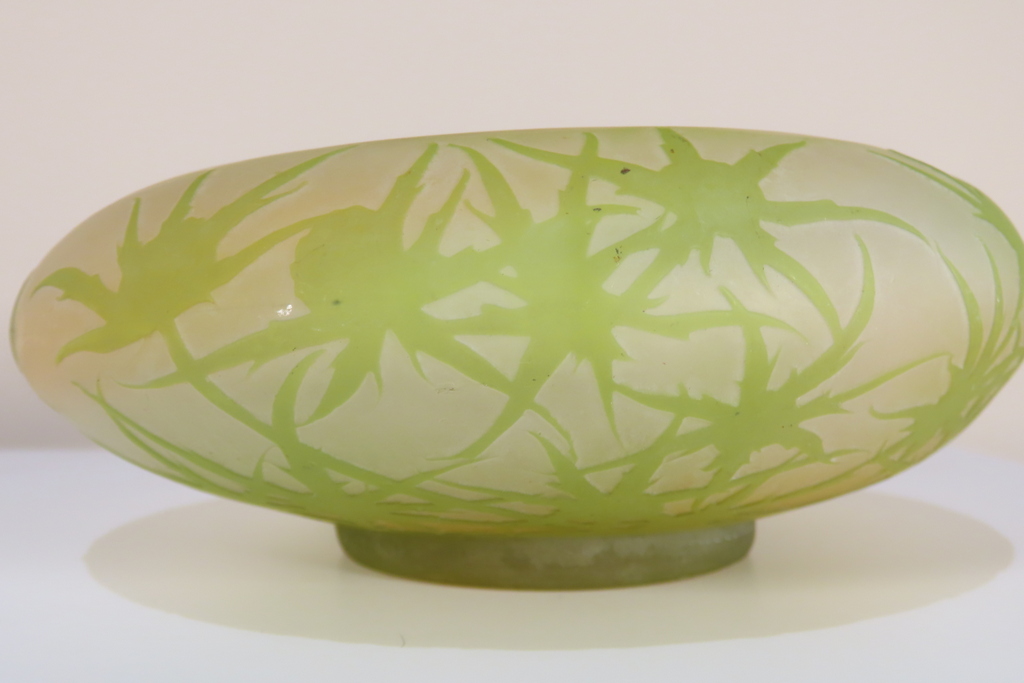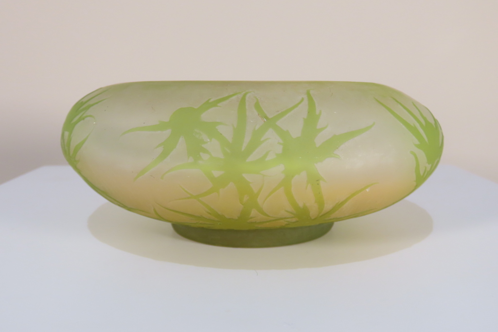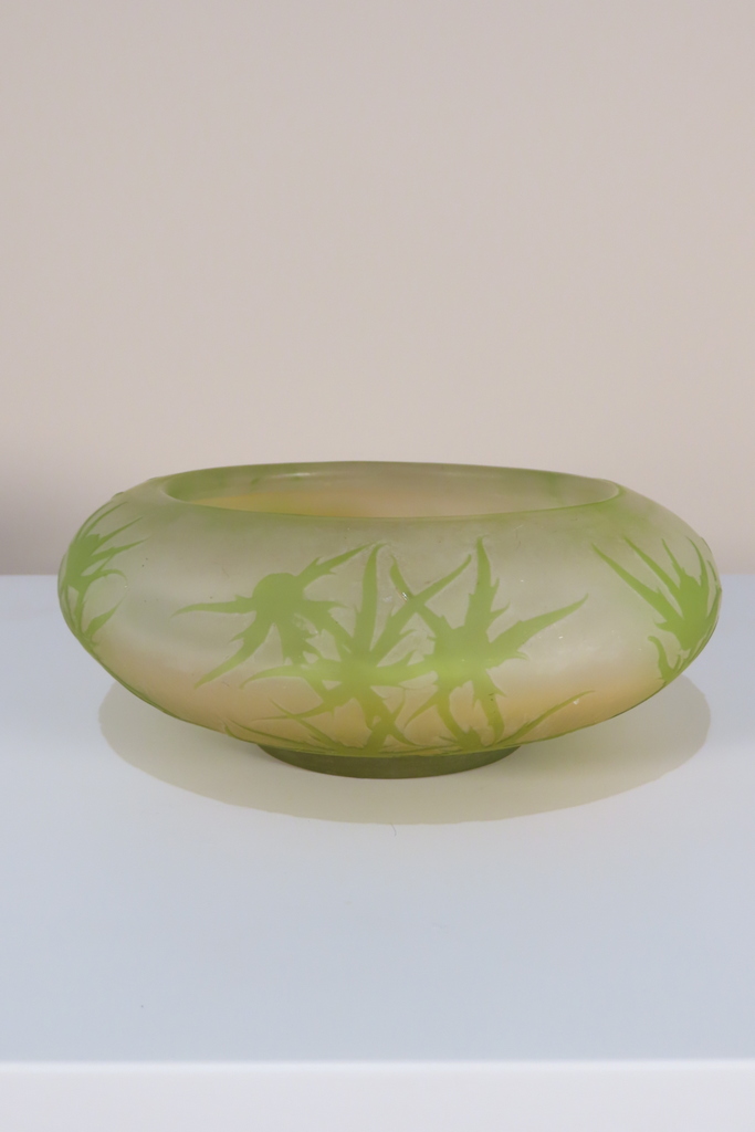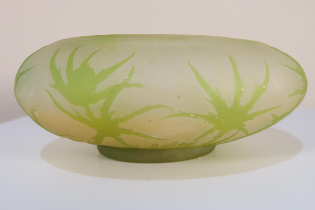 Coupe en verre multi couche dégagé à l’acide à décor de chardons de couleur vert sur fond blanc rosé. Cette coupe porte la signature de Gallé, elle est en bel état, juste la présence d’un micro micro éclat en pourtour de la base, visible sur les photos. Coupe d’ époque vers 1900