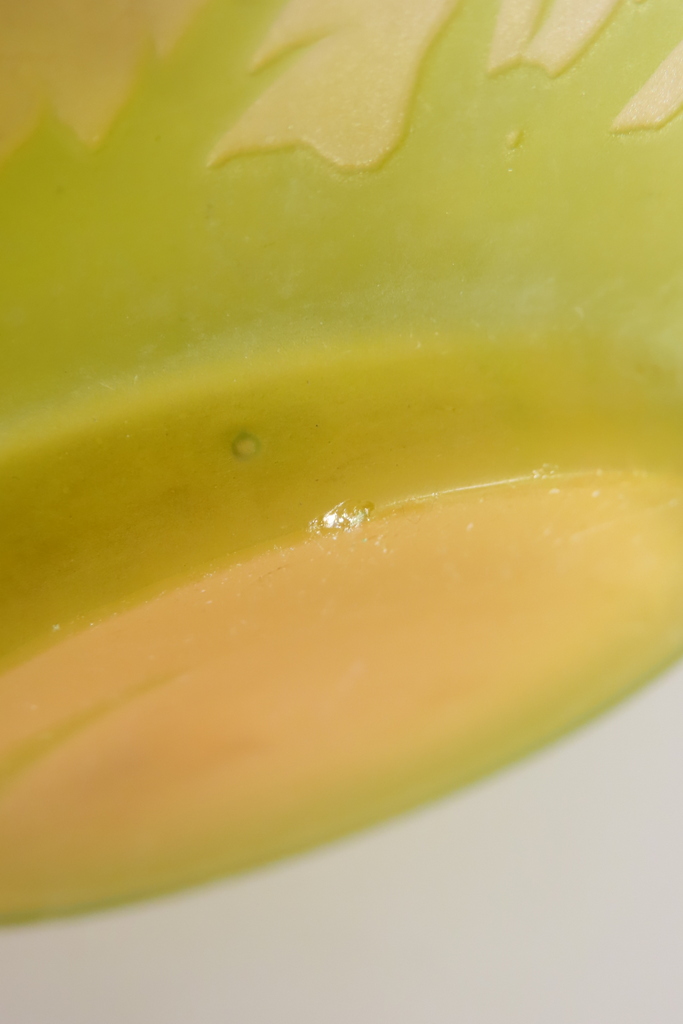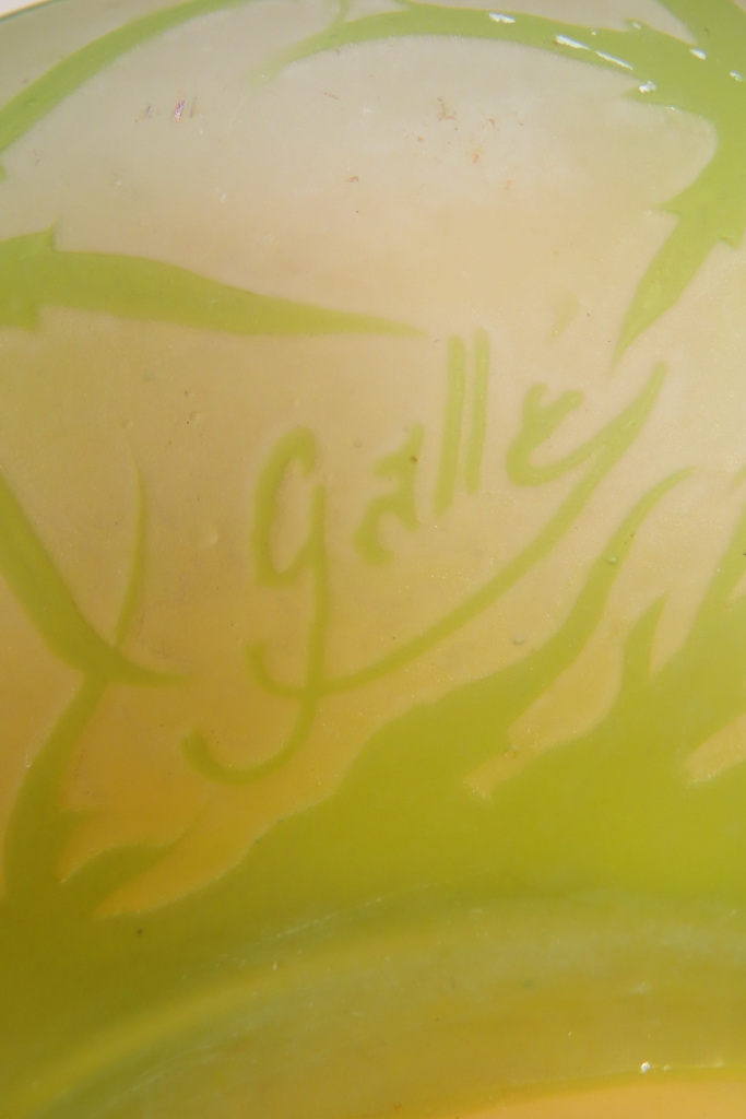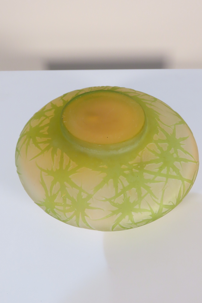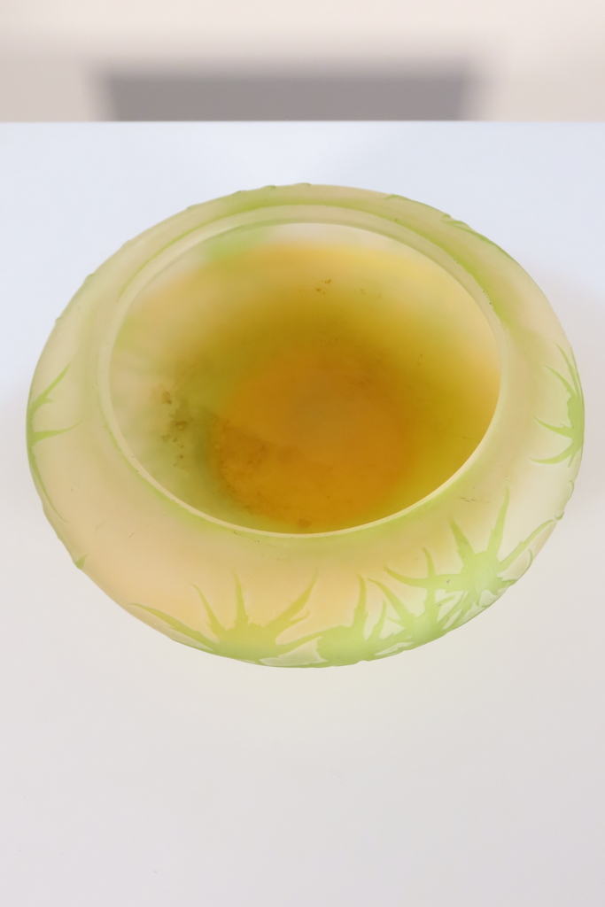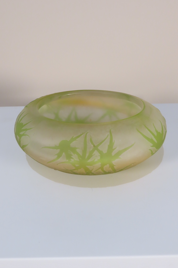 Coupe en verre multi couche dégagé à l’acide à décor de chardons de couleur vert sur fond blanc rosé. Cette coupe porte la signature de Gallé, elle est en bel état, juste la présence d’un micro micro éclat en pourtour de la base, visible sur les photos. Coupe d’ époque vers 1900