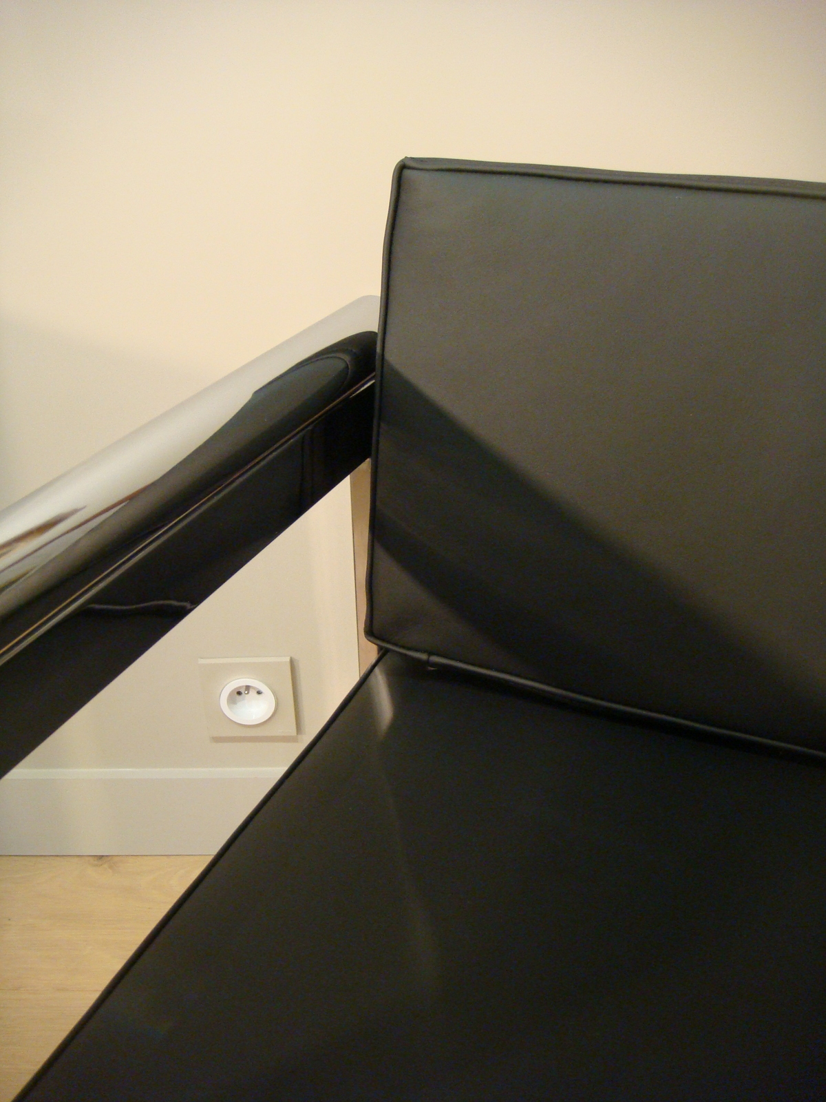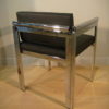 Fauteuil de bureau de forme carré en acier chromé à tubulure en accotoir. Fauteuil garni de deux coussins retapissés en cuir de couleur noir mat. Siège en superbe état, il présence juste quelques micro rayures d’usage. Epoque vers 1970