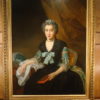 Ecole Française du XVIII ème Siècle. Huile sur toile , portrait de jeune femme habillée d’une robe de couleur verte et rose à fleur et dentelle, avec un tablier noir fermé par un très joli noeud rayé vert et blanc. Elle est assise sur une chaise Louis XV, tenant dans sa main gauche un livre, avec à sa droite une petite table louis XVI, sur laquelle se trouve une boite à ouvrage. Présence de quelques restaurations et repeints.