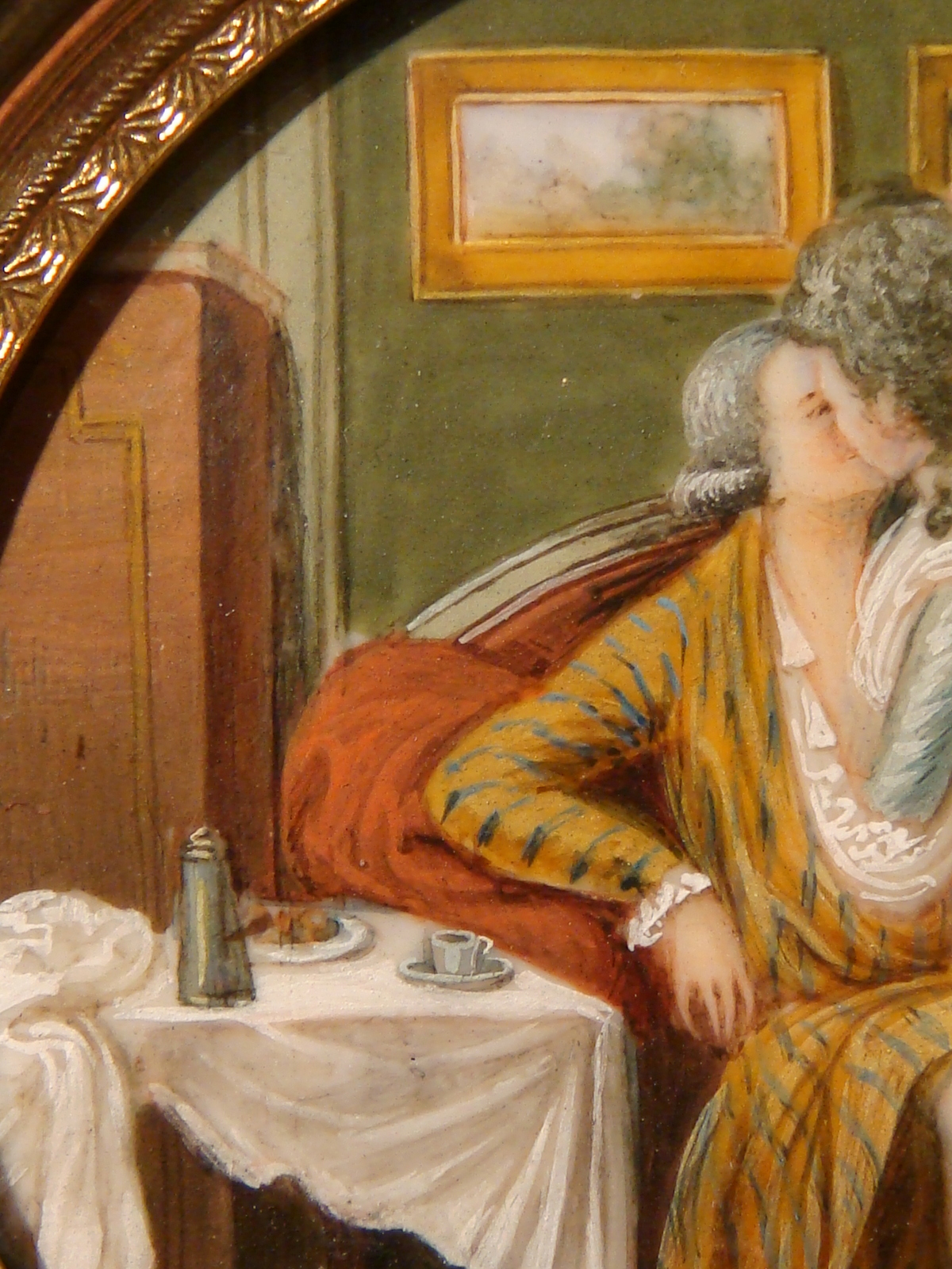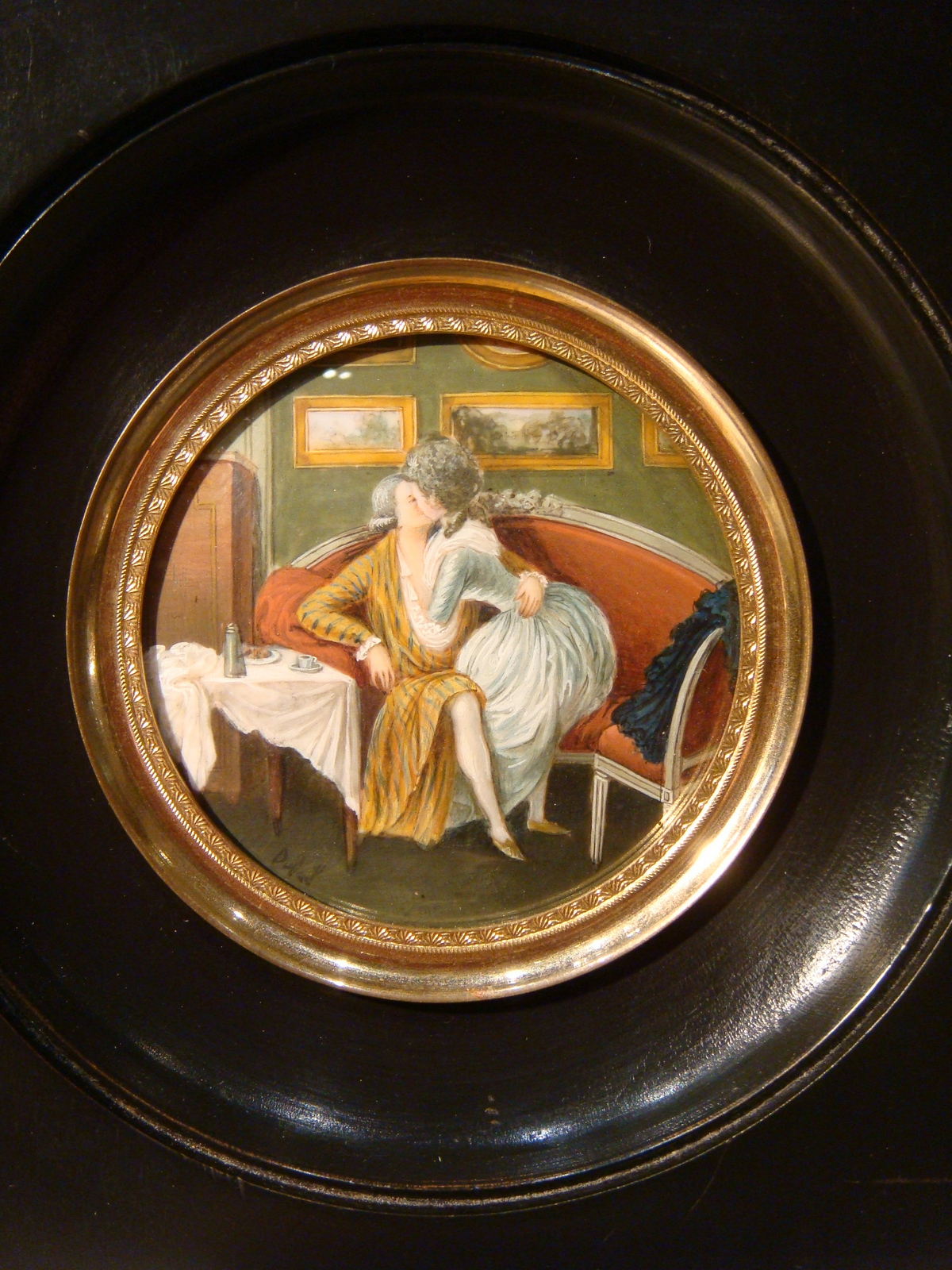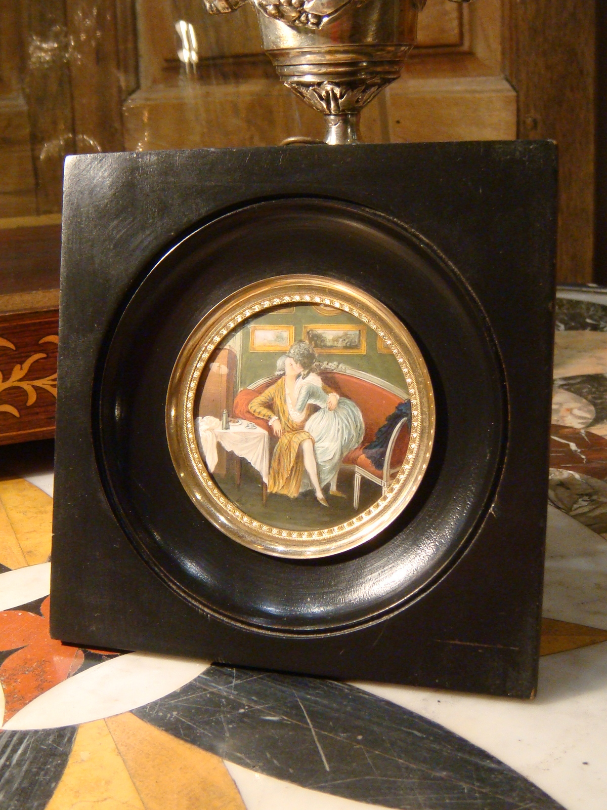 Miniature peinte sur plaque d’ivoire représentant une scène coquine de deux personnages enlacés sur un canapé, dans un intérieur louis XVI mobilier, cadre au mur, petite table volante nappée avec une chocolatière et tasse. Cette miniature porte une signature en bas à gauche difficilement déchiffrable. Elle est présentée sous verre bordée d’un pourtour de laiton ciselé et doré et d’un cadre en bois de poirier noirci. Miniature d’époque fin XIX ème Siècle.