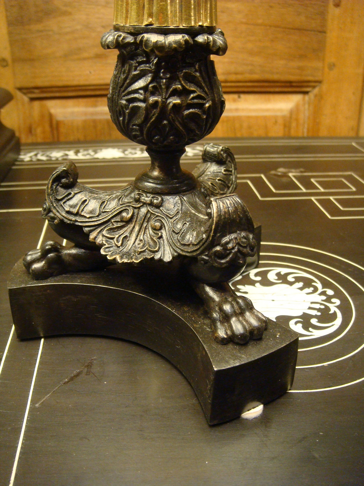 Paire de bougeoirs en bronze brun et bronze doré, fût à cannelures sur une base tripode agrémentée de pieds griffes pâtes de lion, palmettes et feuilles d’acanthe. Binet en forme de vase Médicis. Ces bougeoirs ont été montées en lampes avec une électrification entièrement revue, abat jour recouvert de tissus noir. Bougeoirs d’époque Charles X.