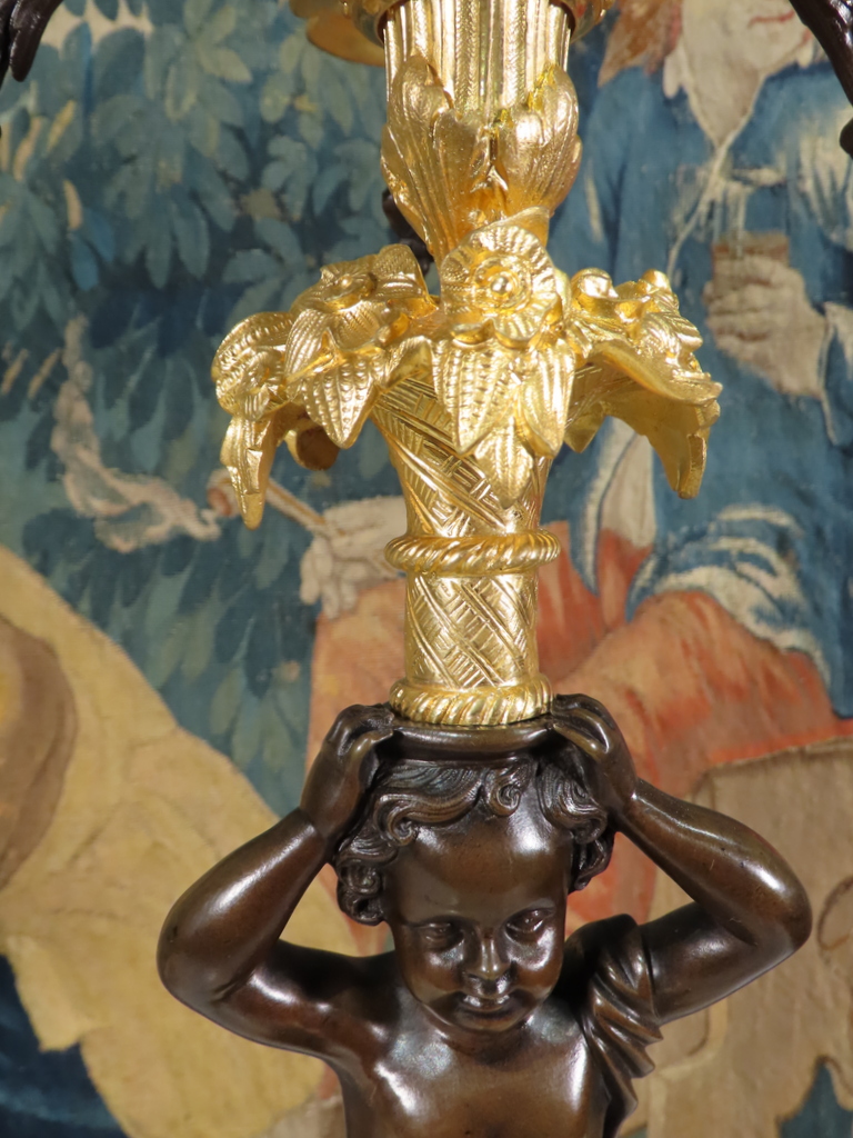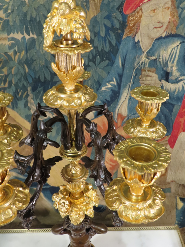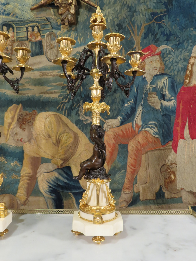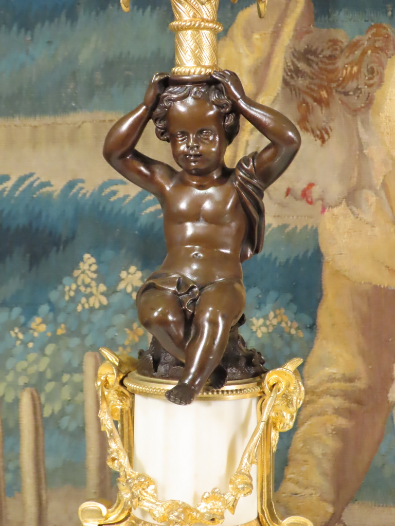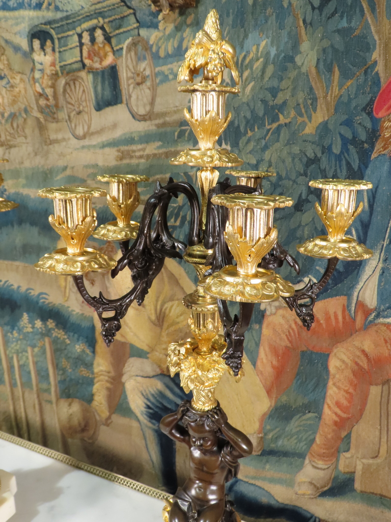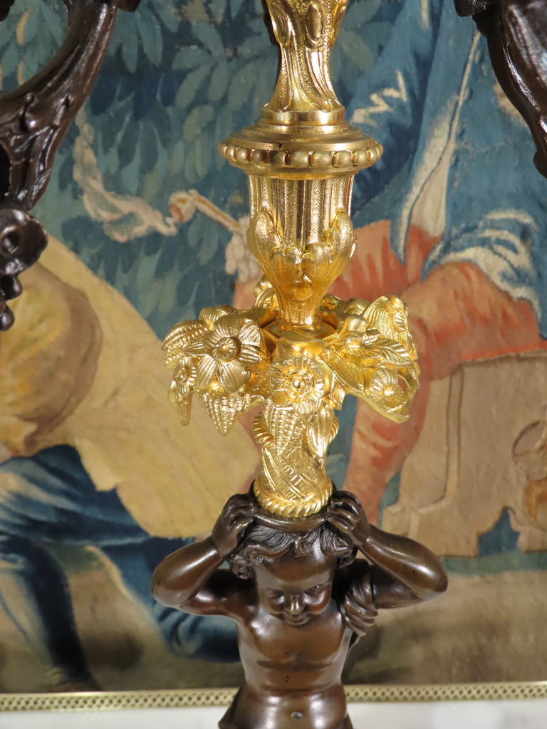 Paire de candélabres aux amours en bronze brun et bronze doré à six lumières, à riche décor de paniers fleuris, guirlandes et têtes de béliers. Ils sont présentés sur des bases en marbre blanc, soutenues par quatre boules aplaties. Présence de leur patine et dorure d’origine avec quelques petites usures à celle-ci. Ils ont conservés leur amortissement amovible, présent sur le binet central. Deux intérieurs de bobèche anciennement ressoudés à l’étain. Candélabres d’époque Napoléon III – Second Empire.