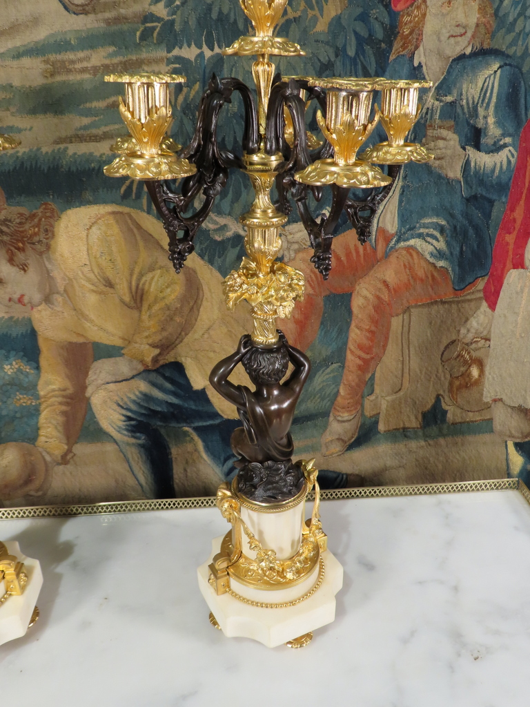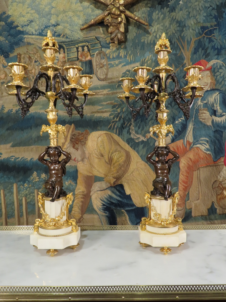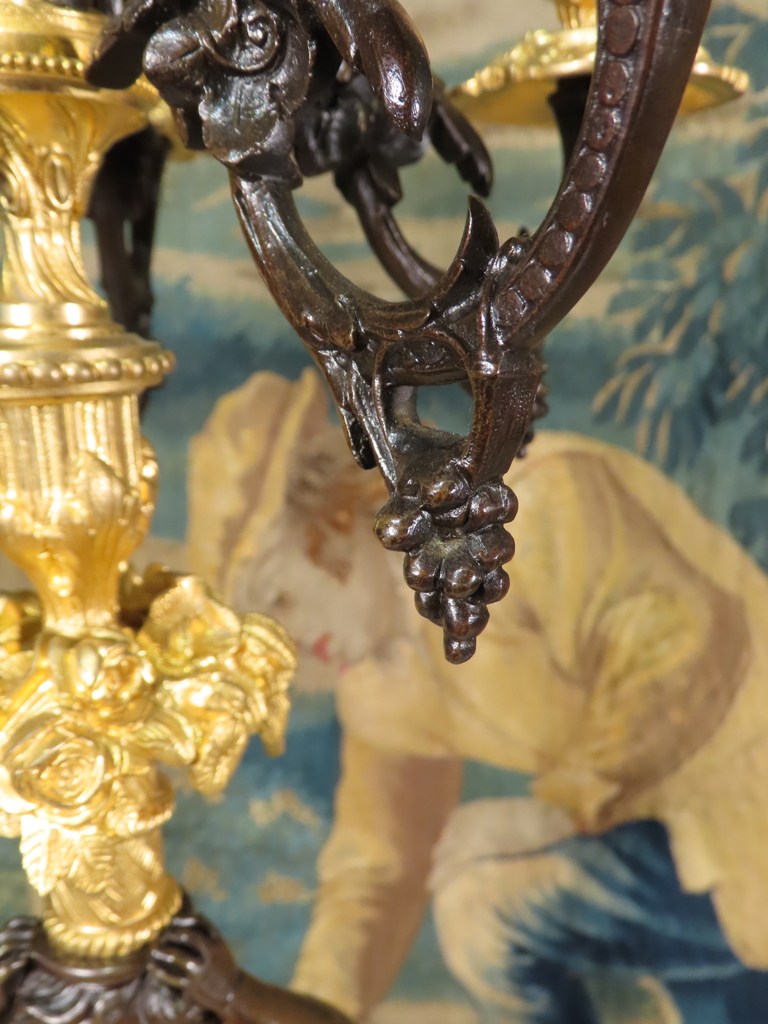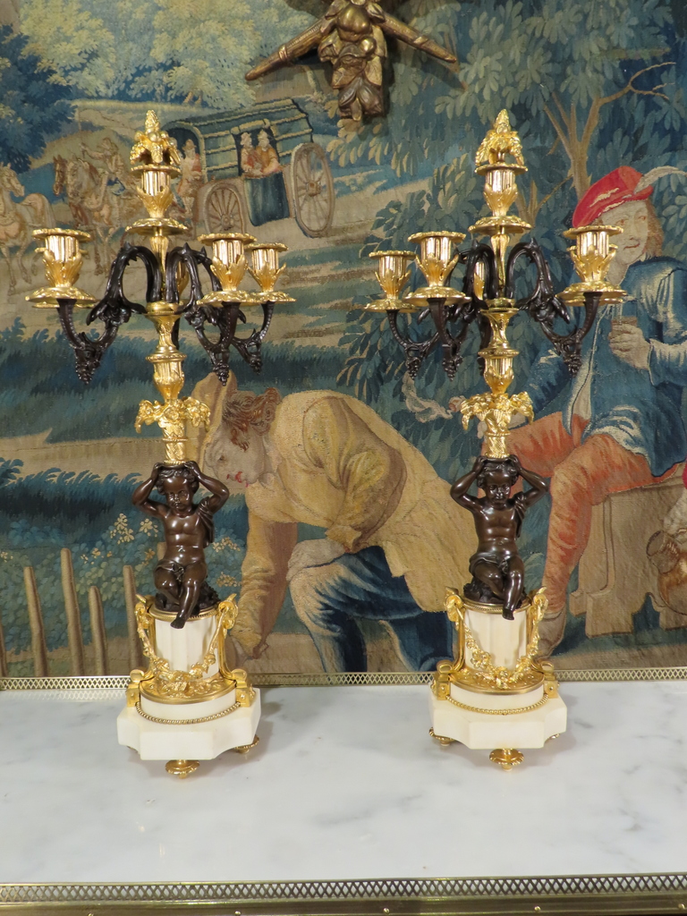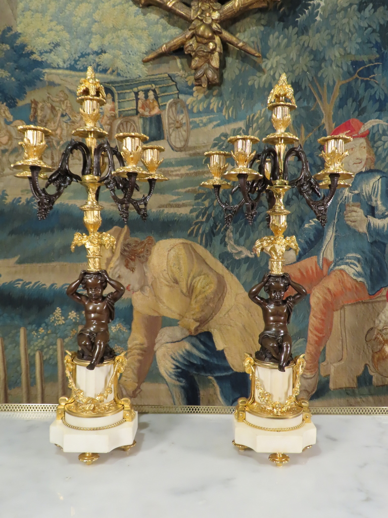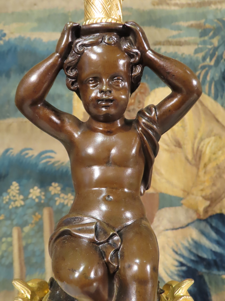 Paire de candélabres aux amours en bronze brun et bronze doré à six lumières, à riche décor de paniers fleuris, guirlandes et têtes de béliers. Ils sont présentés sur des bases en marbre blanc, soutenues par quatre boules aplaties. Présence de leur patine et dorure d’origine avec quelques petites usures à celle-ci. Ils ont conservés leur amortissement amovible, présent sur le binet central. Deux intérieurs de bobèche anciennement ressoudés à l’étain. Candélabres d’époque Napoléon III – Second Empire.