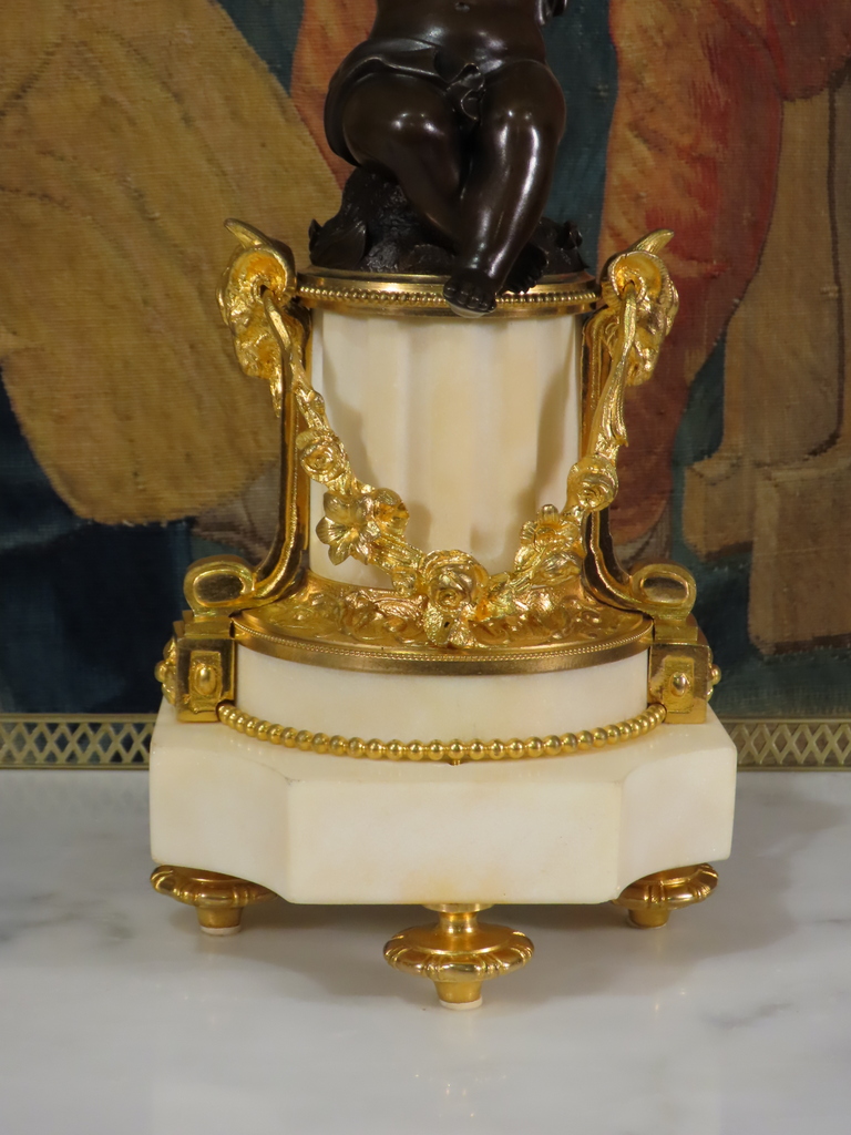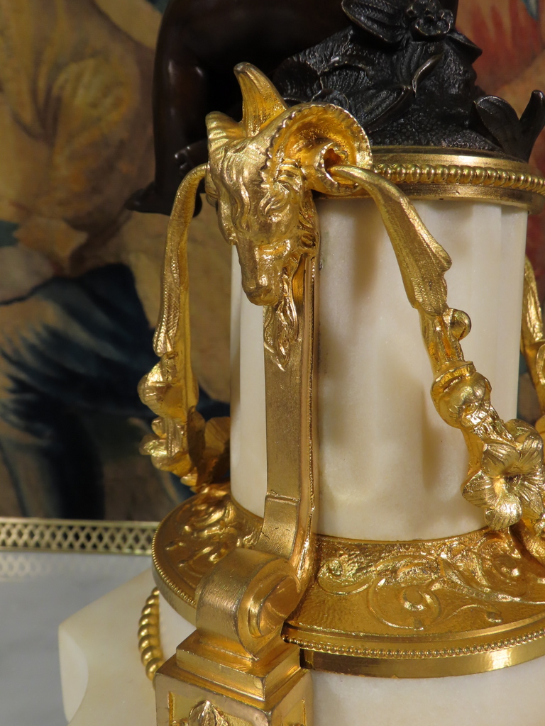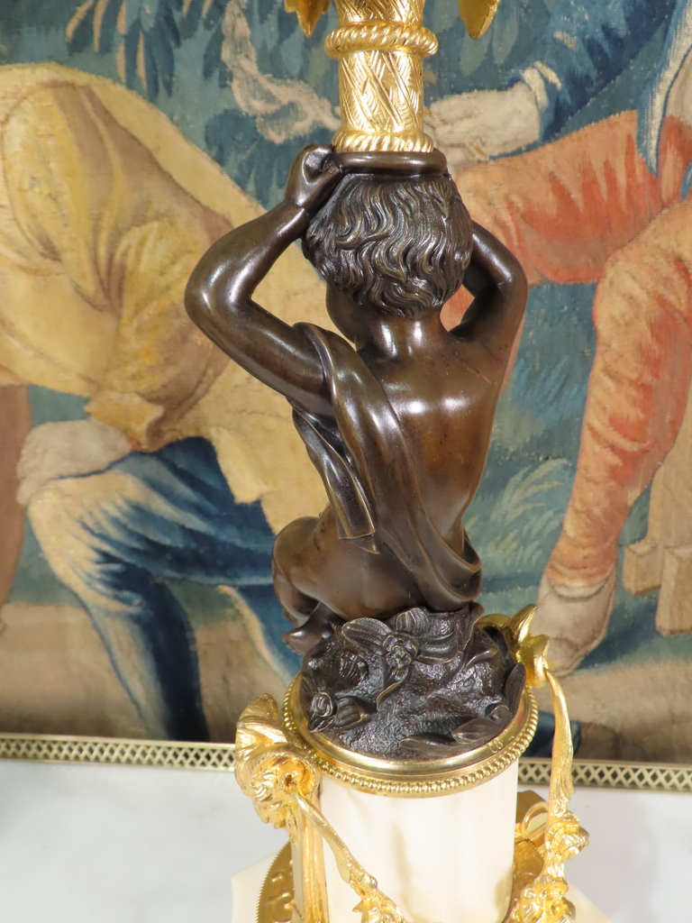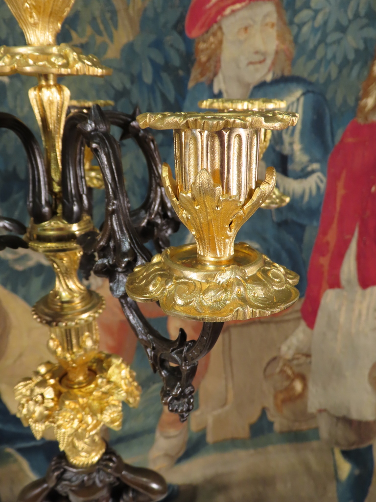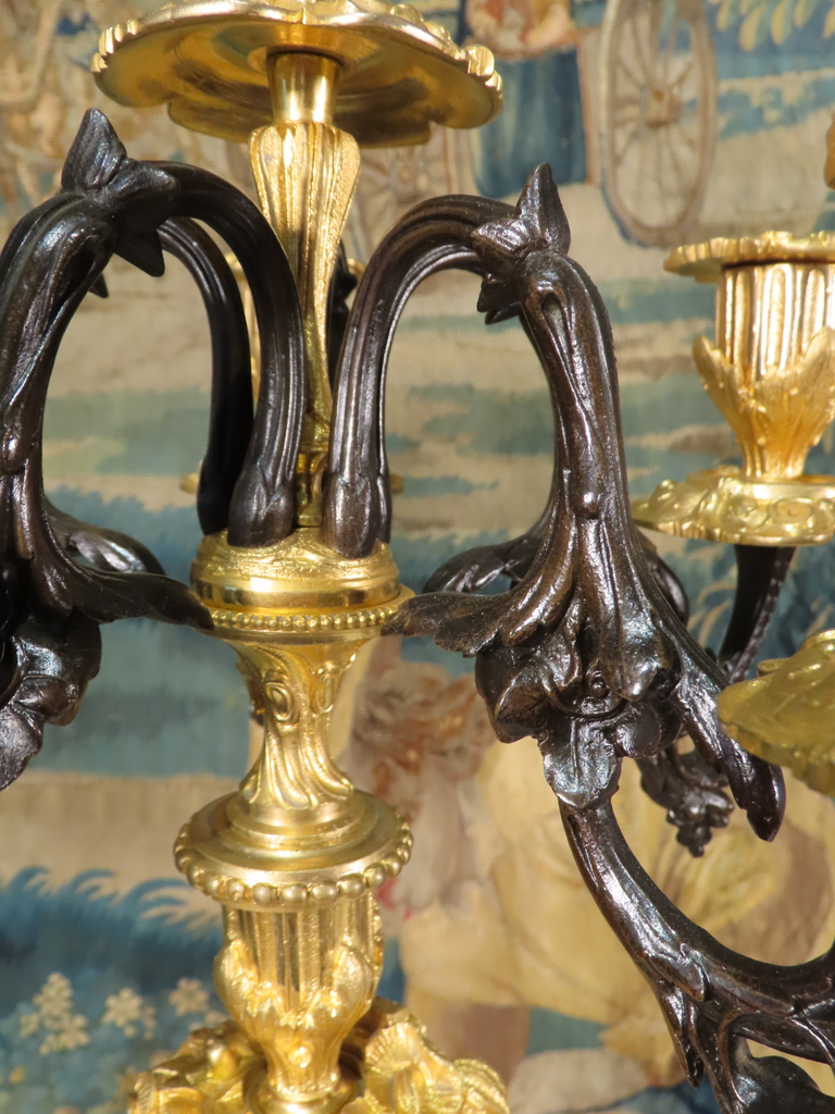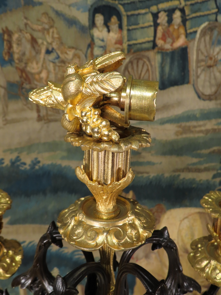 Paire de candélabres aux amours en bronze brun et bronze doré à six lumières, à riche décor de paniers fleuris, guirlandes et têtes de béliers. Ils sont présentés sur des bases en marbre blanc, soutenues par quatre boules aplaties. Présence de leur patine et dorure d’origine avec quelques petites usures à celle-ci. Ils ont conservés leur amortissement amovible, présent sur le binet central. Deux intérieurs de bobèche anciennement ressoudés à l’étain. Candélabres d’époque Napoléon III – Second Empire.