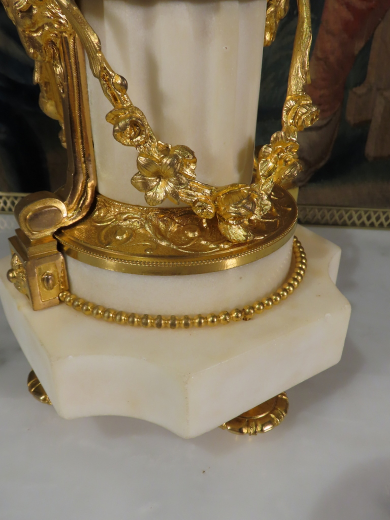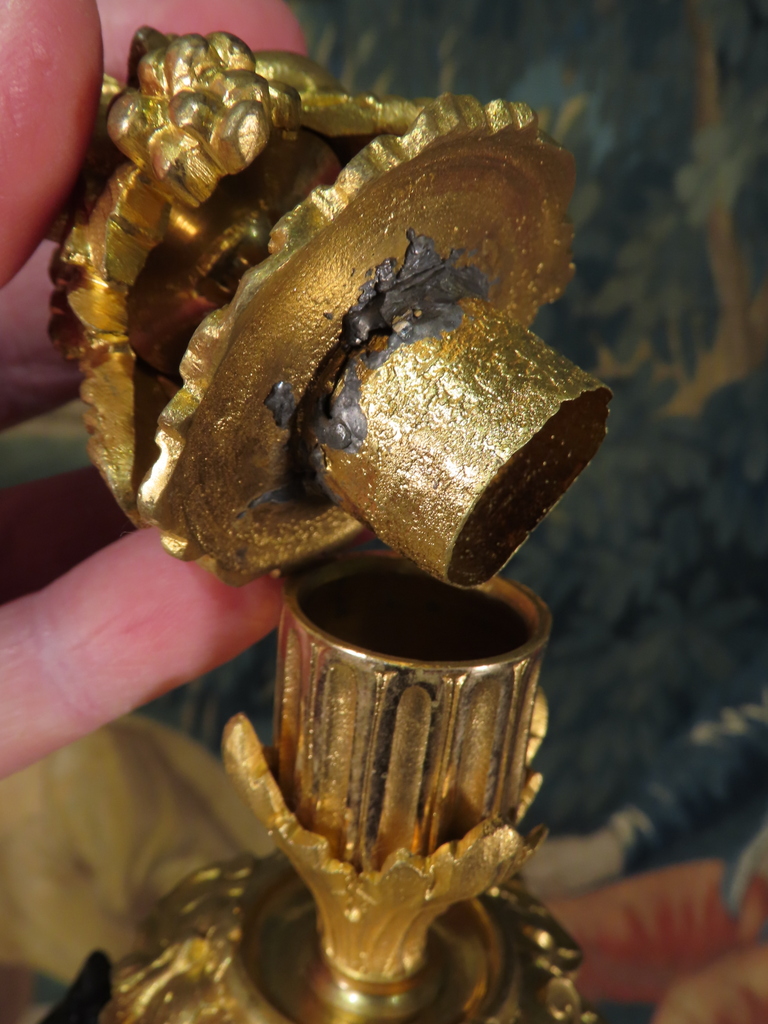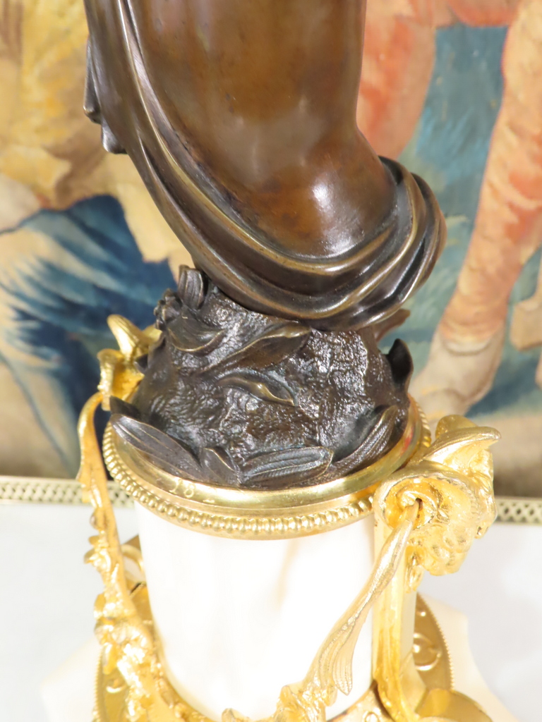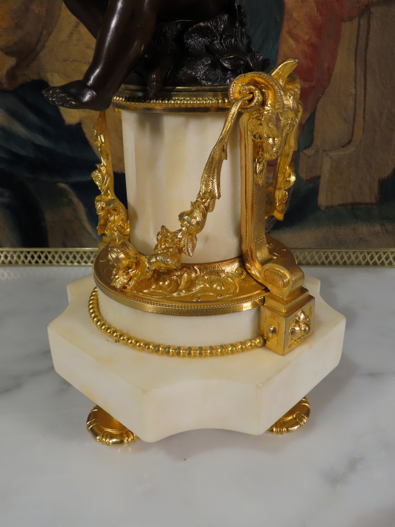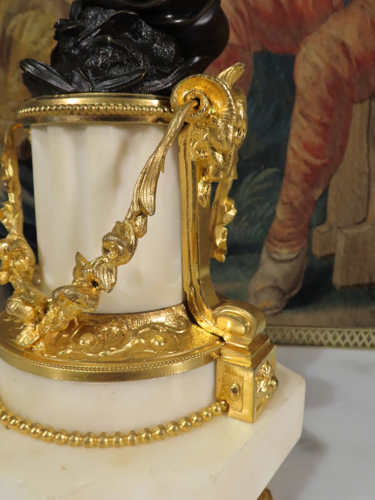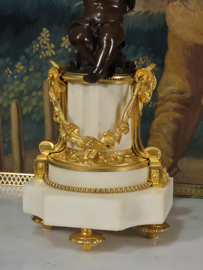 Paire de candélabres aux amours en bronze brun et bronze doré à six lumières, à riche décor de paniers fleuris, guirlandes et têtes de béliers. Ils sont présentés sur des bases en marbre blanc, soutenues par quatre boules aplaties. Présence de leur patine et dorure d’origine avec quelques petites usures à celle-ci. Ils ont conservés leur amortissement amovible, présent sur le binet central. Deux intérieurs de bobèche anciennement ressoudés à l’étain. Candélabres d’époque Napoléon III – Second Empire.