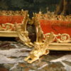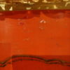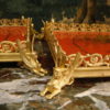Paire de plateaux , surtout de table de style Empire en laque de couleur rouge orangé décoré à l’or de fruits fleurs et feuillages dans des réserves à riche monture de bronze doré. Galerie en volute feuillagée soutenue par 4 pieds en sphinge ailé . Présence de manques et éclats sur un des plateau de laque et quelques usures à la dorure. Bel élément de décoration d’époque second Empire.