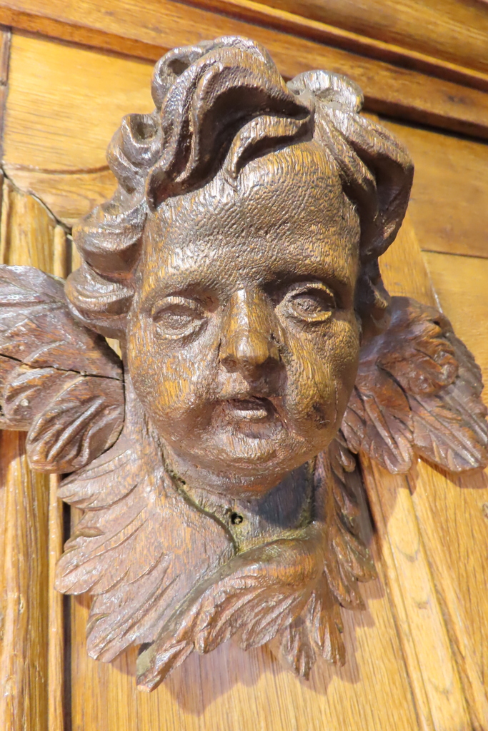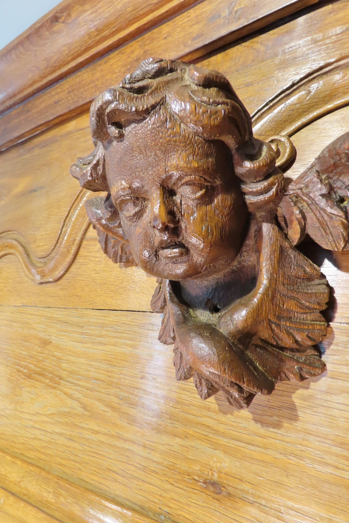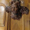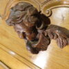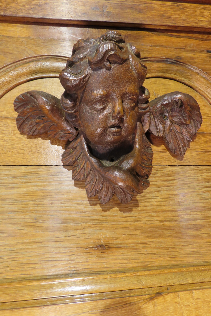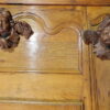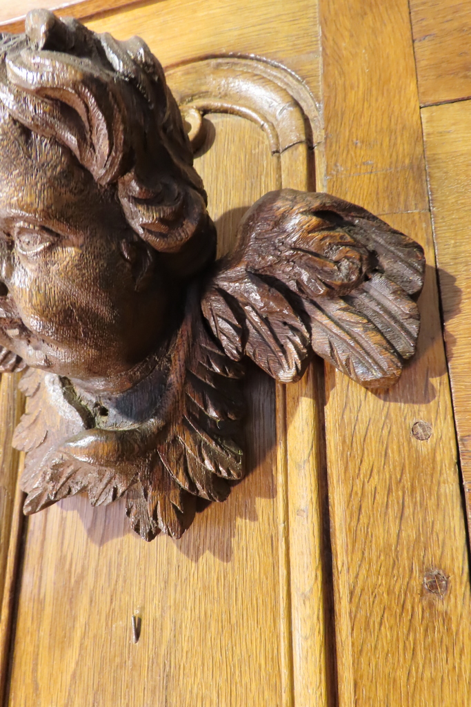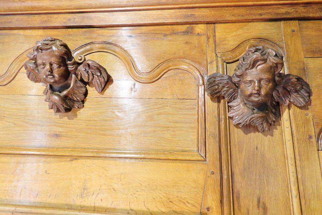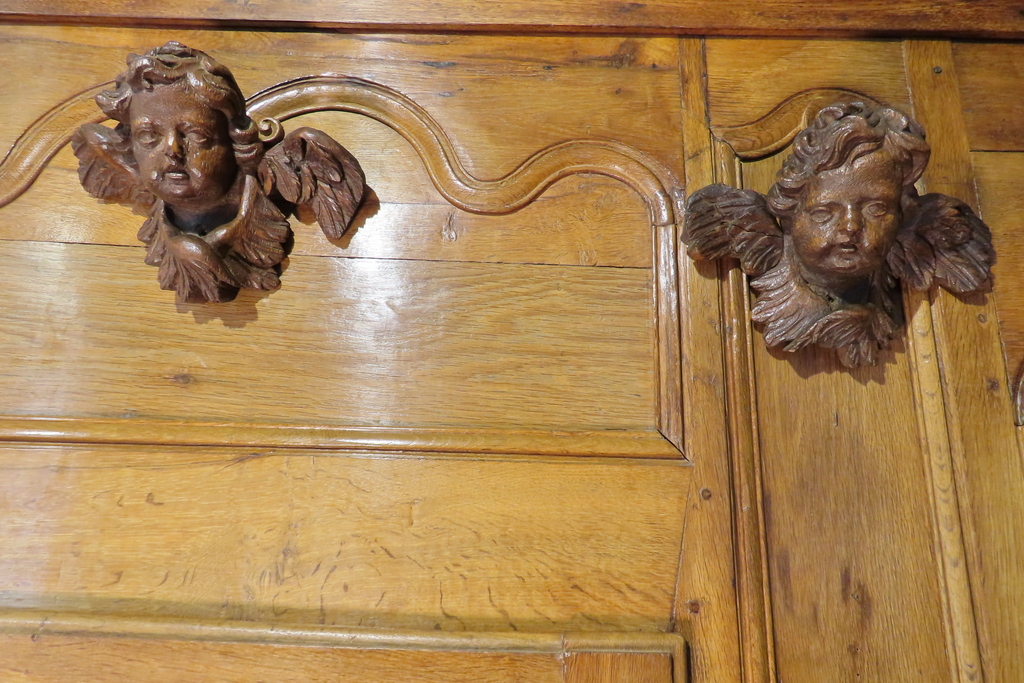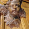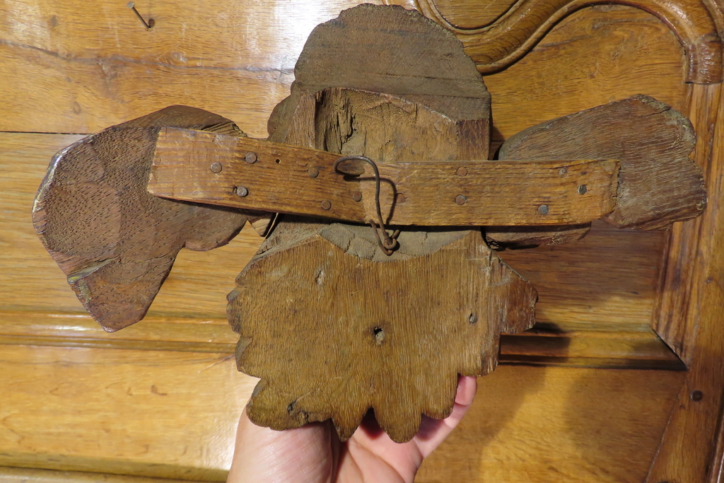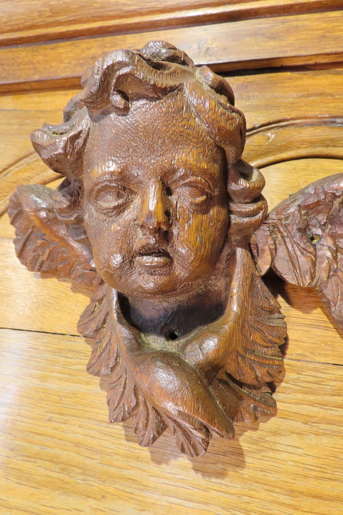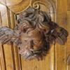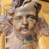 Paire de petites têtes d’anges, ailées, en bois de chêne sculpté et patiné. Présence de quelques fentes et ajout sur l’arrière de morceau de bois pour tenir les ailes. Têtes d’époque fin XVIII ème Siècle.