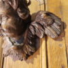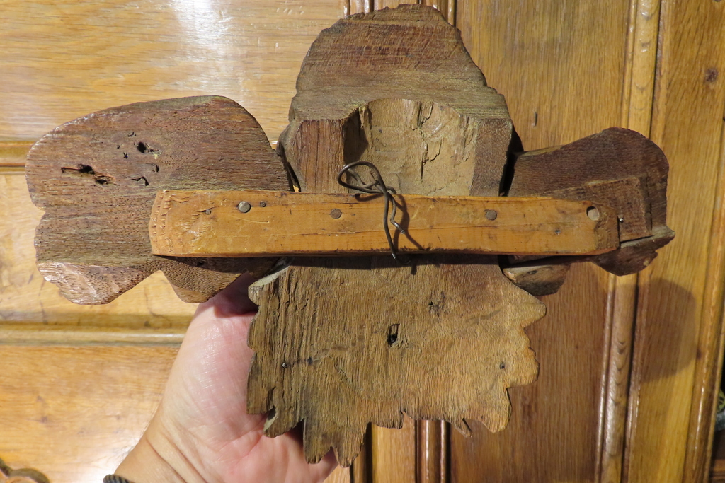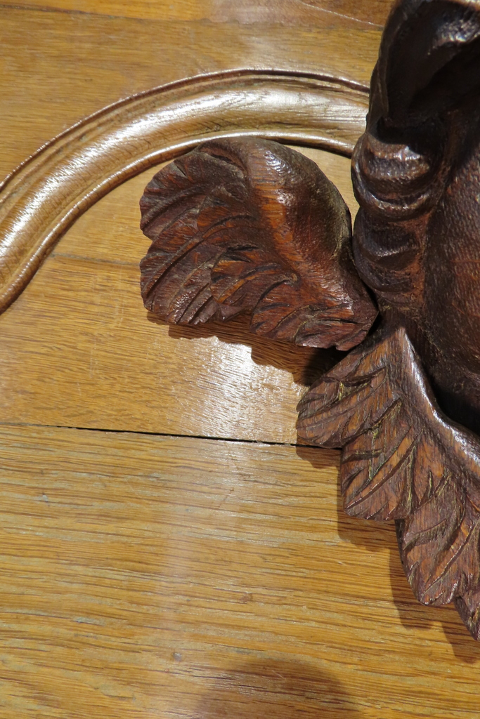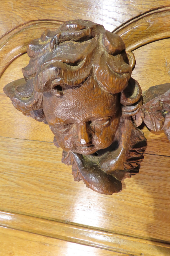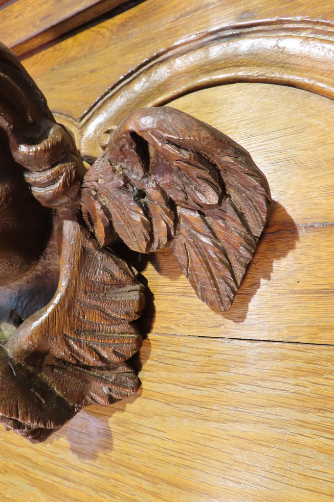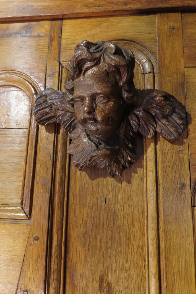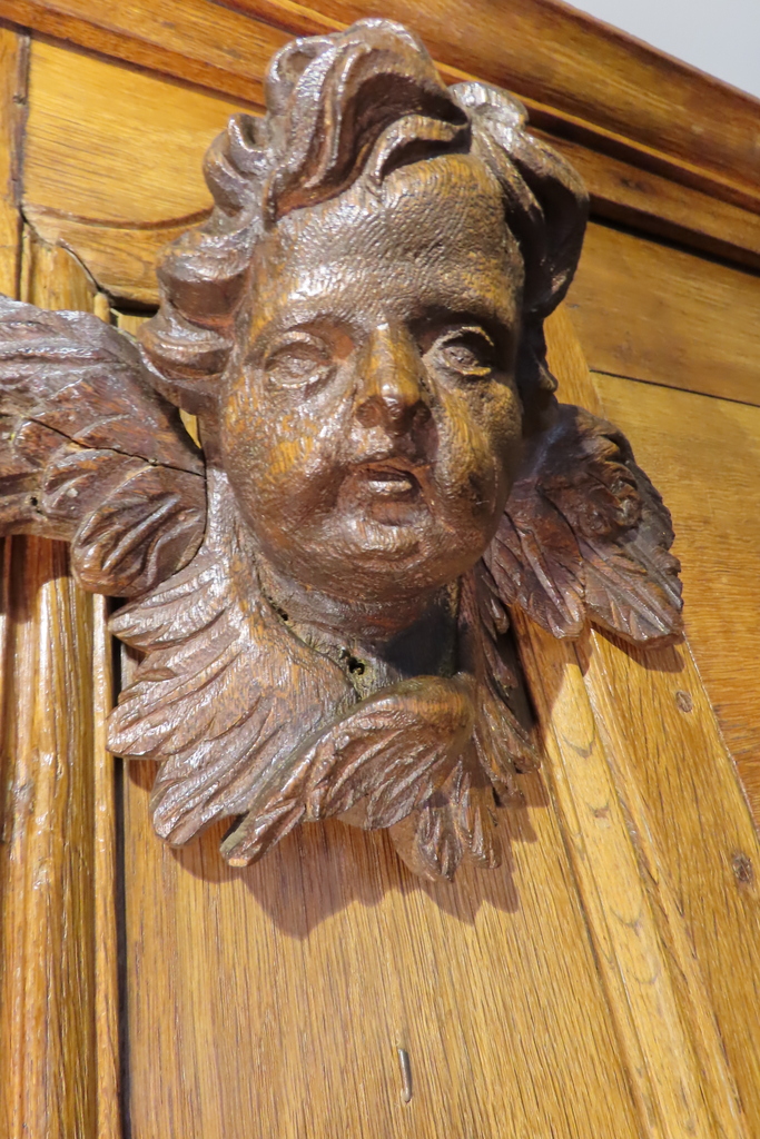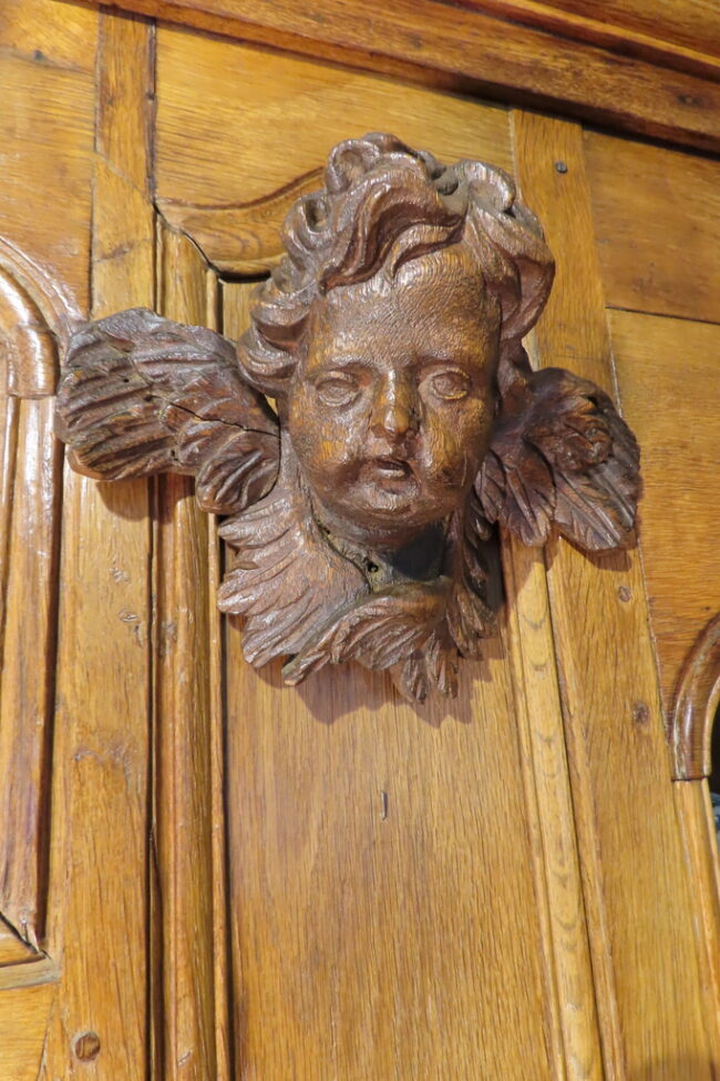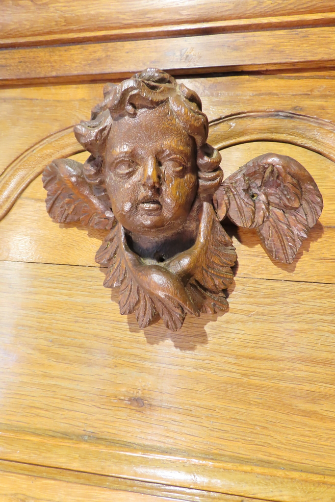 Paire de petites têtes d’anges, ailées, en bois de chêne sculpté et patiné. Présence de quelques fentes et ajout sur l’arrière de morceau de bois pour tenir les ailes. Têtes d’époque fin XVIII ème Siècle.