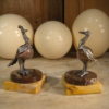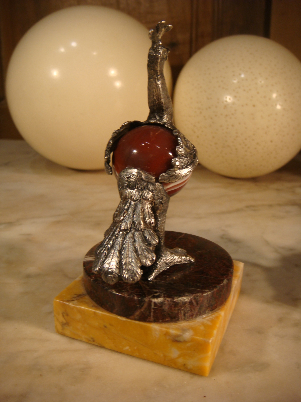 Paire de petits oiseaux en argent ciselé et corps en boule de pierre d’agate , ils reposent sur des socles de marbre veinés rouge et contre socle de marbre jaune de Sienne. Vraisemblablement un travail étranger du XIX éme Siècle. Présence d’un fêle sur une boule en agate d’un oiseau.