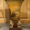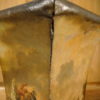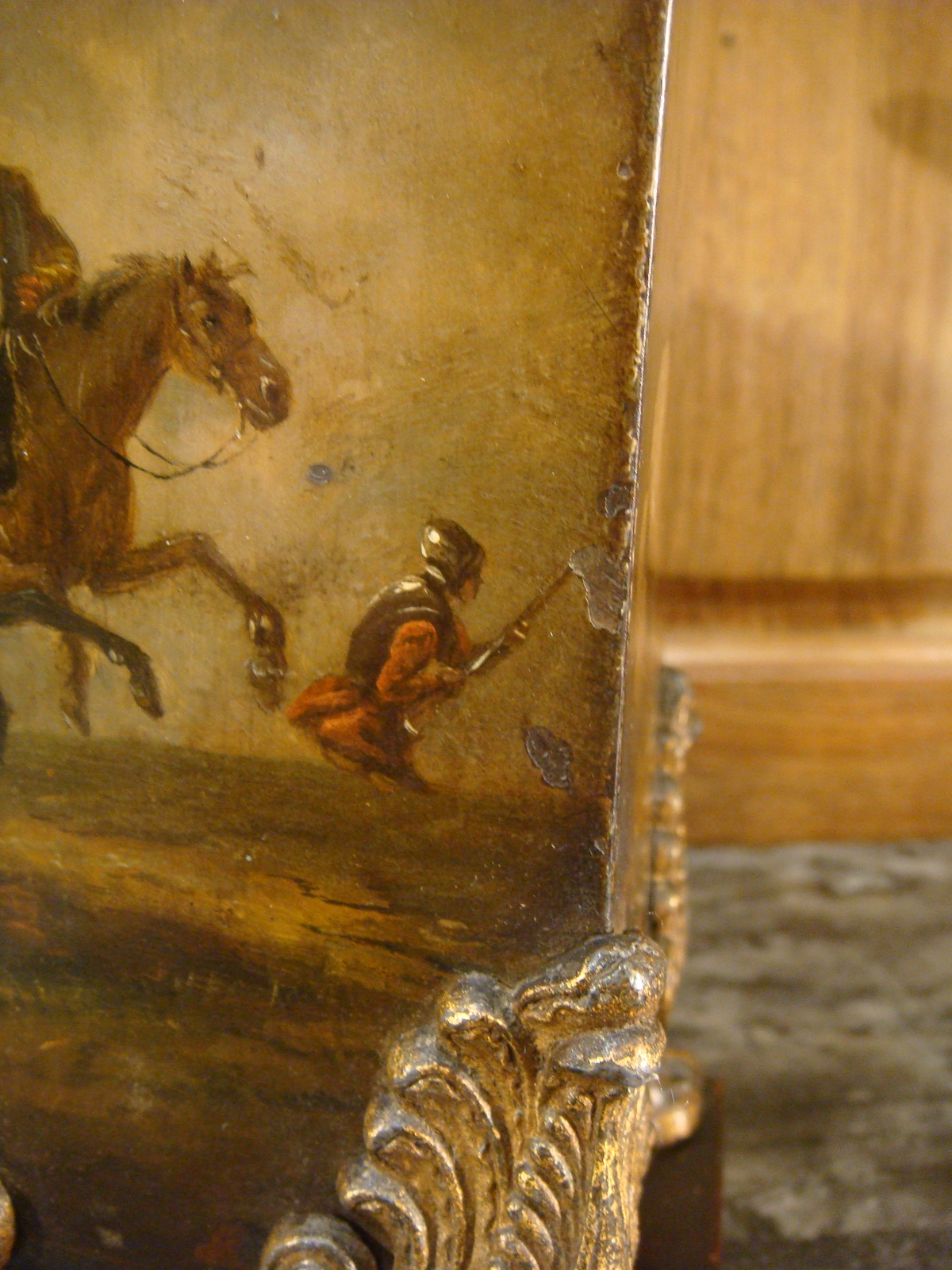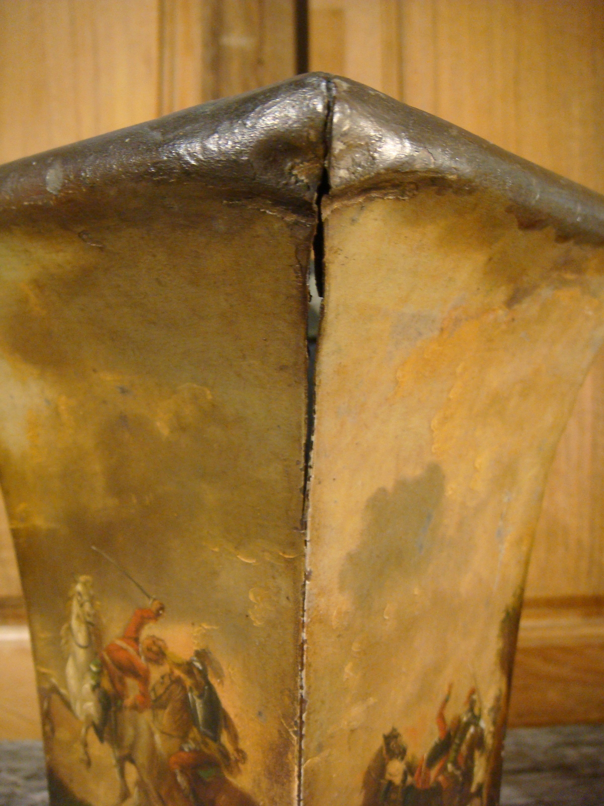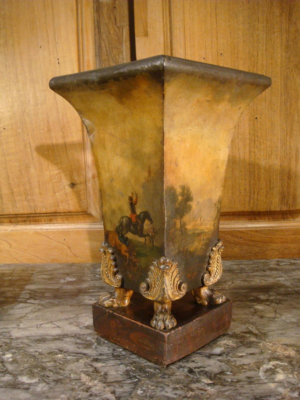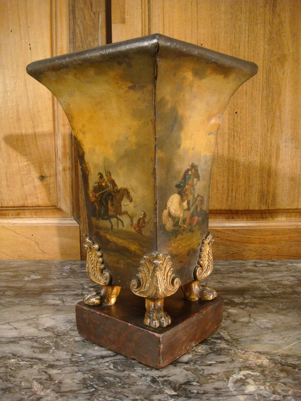 Paire de vases cornet de forme carré en tôle peinte à décor de scènes de batailles, chevaux et militaires et une face avec des personnages dans des paysages. Pieds griffes à feuilles d’acanthe en plomb doré, sur une base en bois en trompe l’oeil peint de faux marbre. Ces vases présentent des fentes, petits éclats à la peinture et petites déformations de la tôle. Objets d’époque 1er Empire.