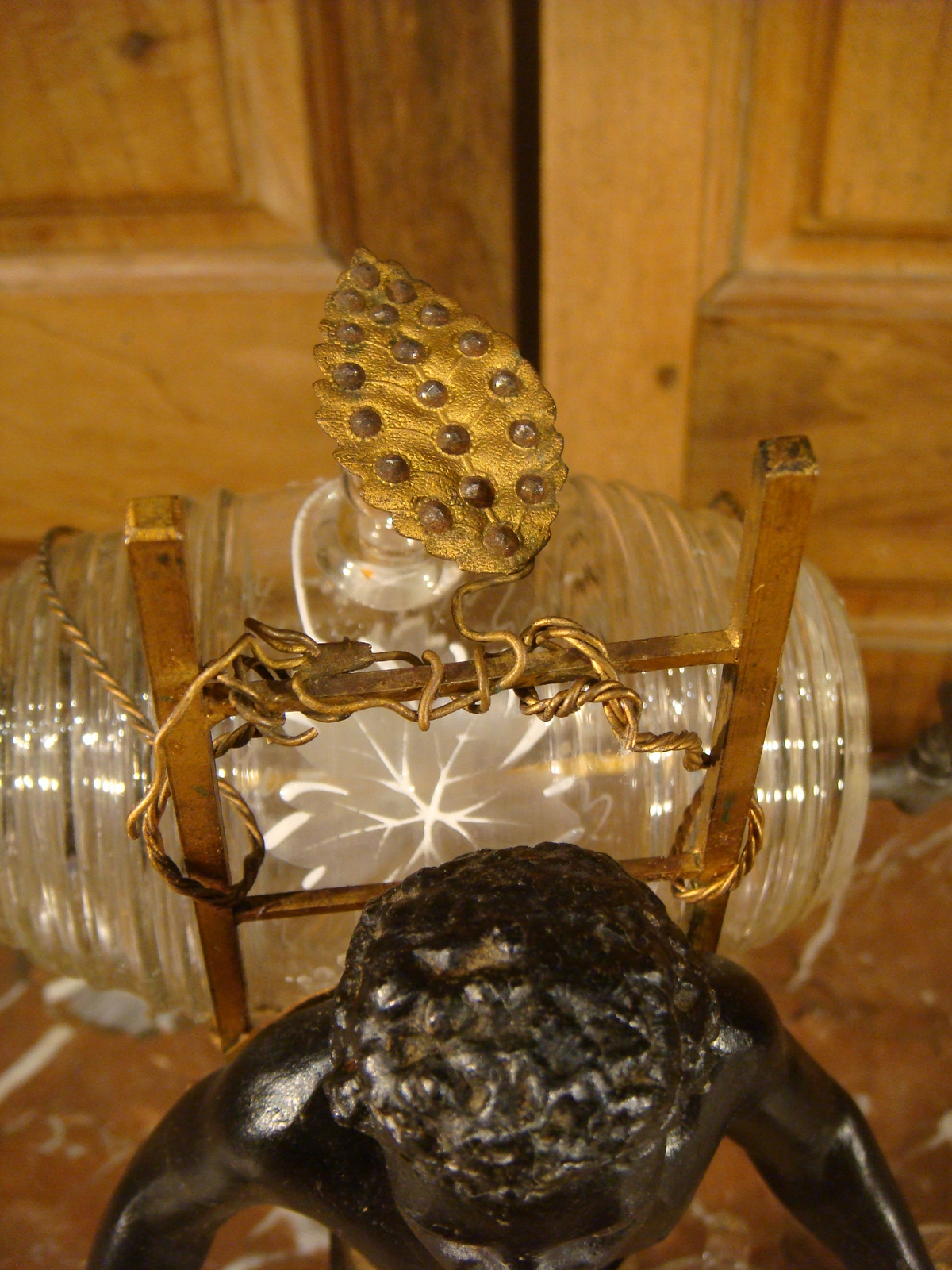 Cave à liqueur, nubien porteur d’eau en régule patiné et laiton doré, avec son support de tonneau et tonneau sur le dos , portant un paniers compartimentés dans chaque main. Ces paniers sont agrémentés de petits verres en verre émaillé à décor d’une feuille de vigne et grappes de raisins, un accidenté, un légèrement fêlé ( visibles sur les photos ) et le manque d’un verre. Cave à liqueur d’époque Napoléon III