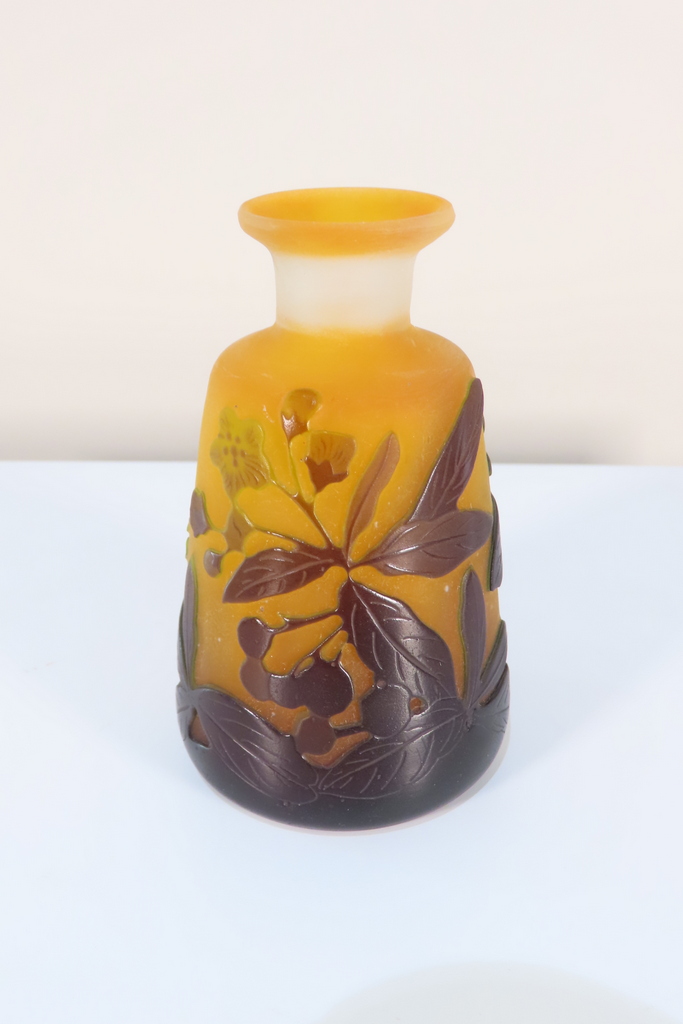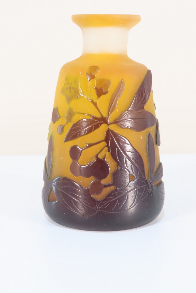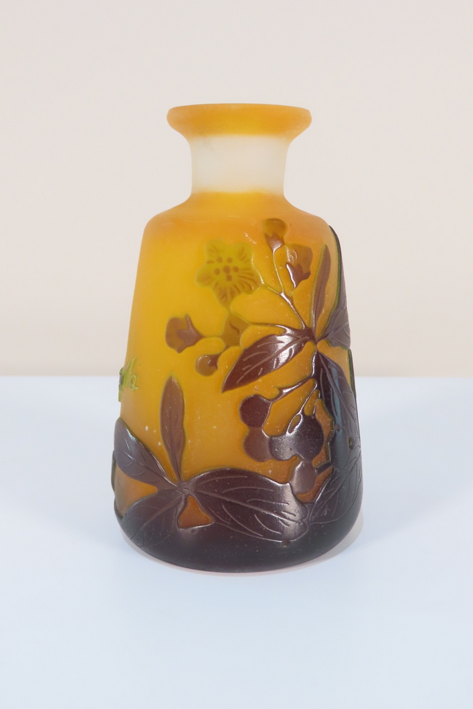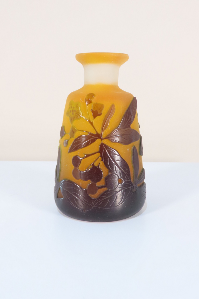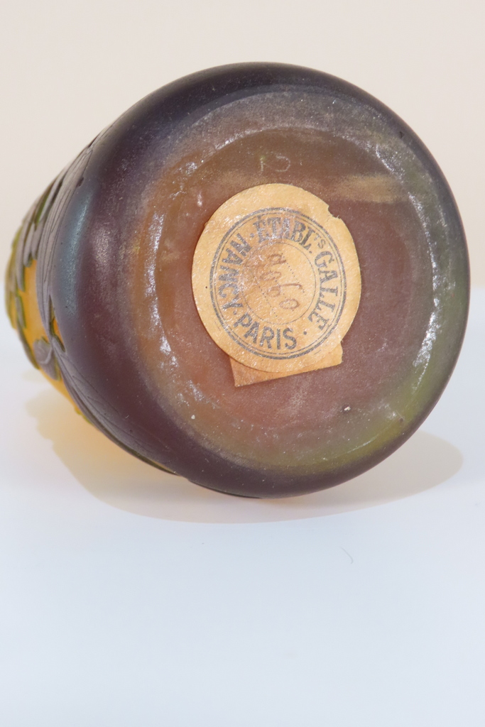 Vase de Gallé en verre multi couche dégagé à l’acide à décor de fleurs et de feuillages brun dégradé vert sur fond orangé blanc. Ce vase porte la signature Gallé ainsi qu’une ancienne étiquette en dessous des établissement Gallé Nancy Paris. Vase en parfait état d’époque 1900