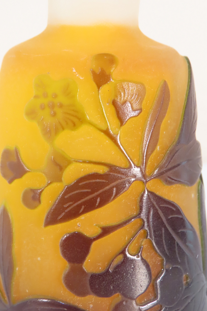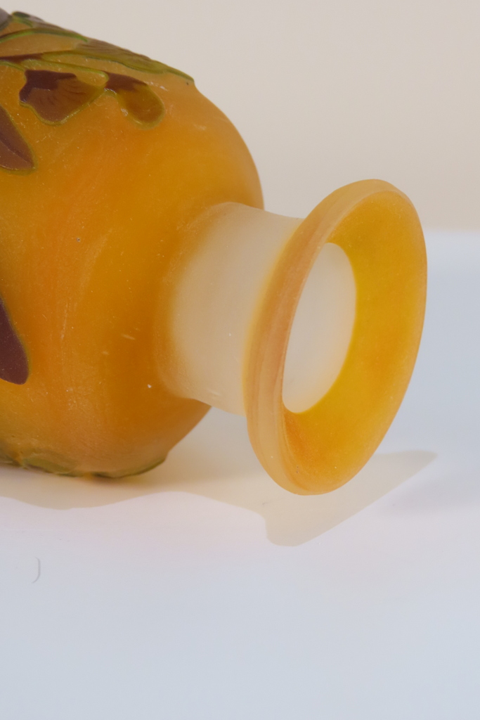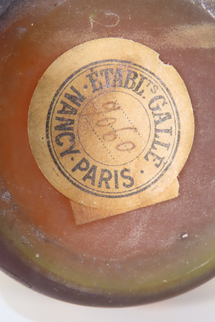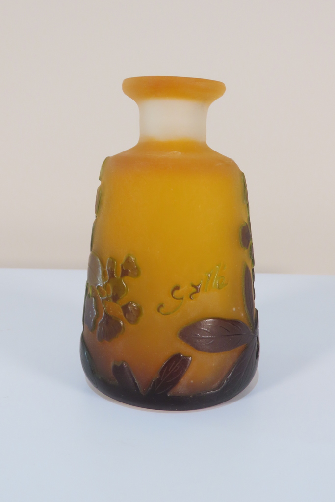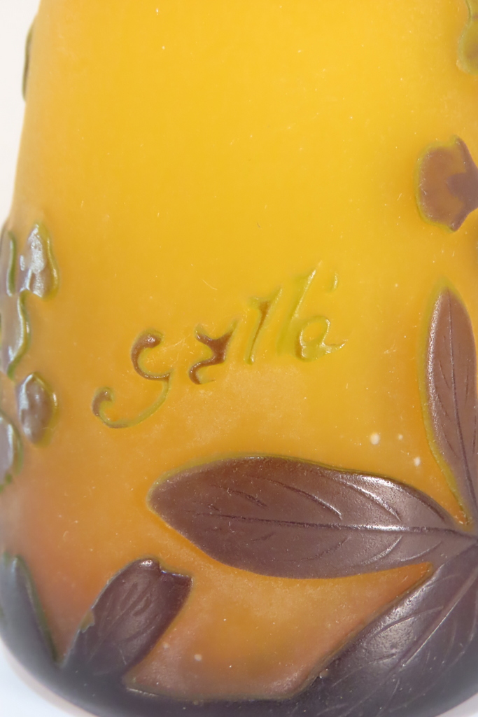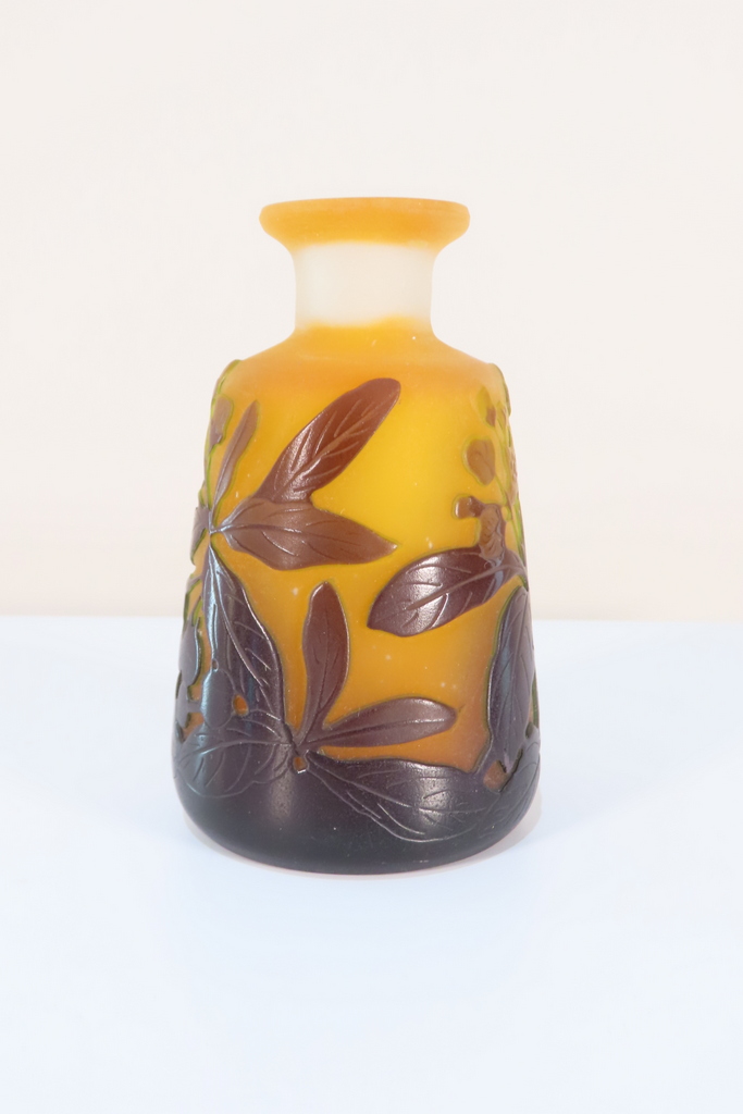 Vase de Gallé en verre multi couche dégagé à l’acide à décor de fleurs et de feuillages brun dégradé vert sur fond orangé blanc. Ce vase porte la signature Gallé ainsi qu’une ancienne étiquette en dessous des établissement Gallé Nancy Paris. Vase en parfait état d’époque 1900