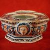 Porte huillier vinaigrier à pans sur pied douche avec à chaque extrémités une tête de personnage, en faïence de Rouen, à décor de rinceaux feuillagés