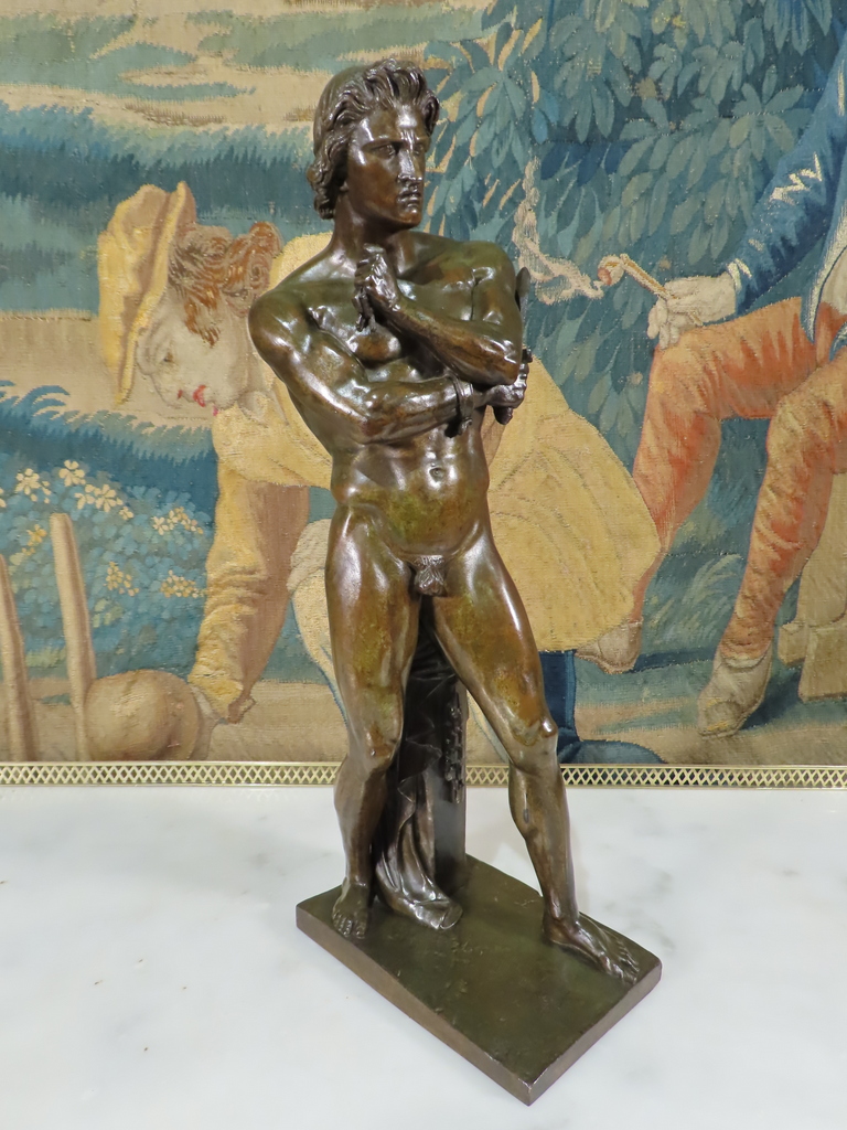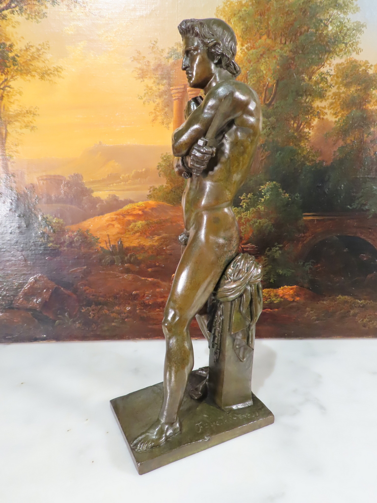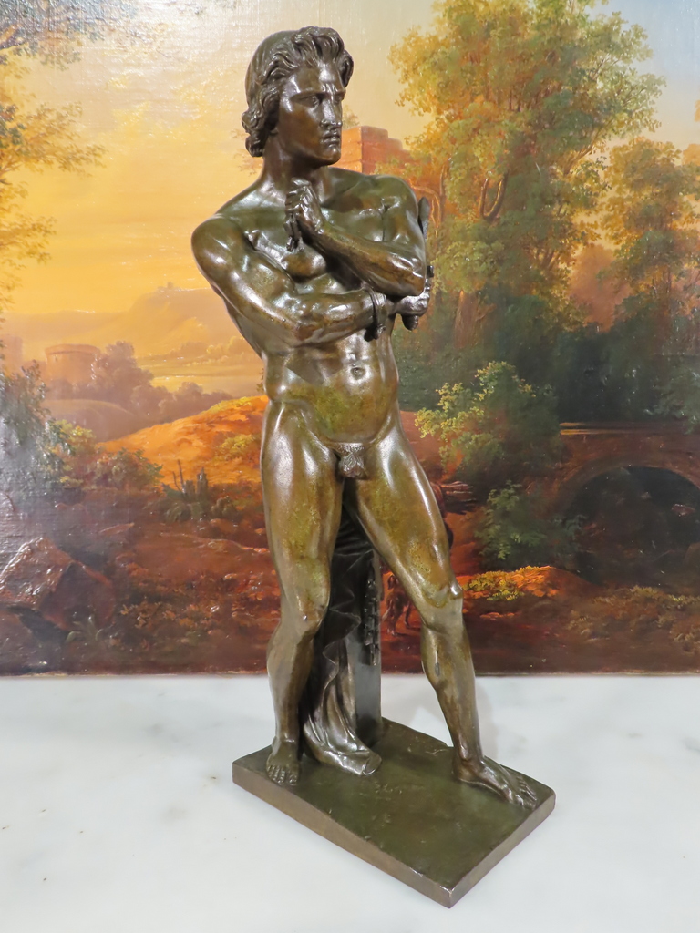Bronze sculpture à patine brune verte représentant Spartacus nu, avec son glaive, venant de briser ses chaînes. Ce bronze porte la signature de Foyatier pour Denis Foyatier ( 1793 – 1863 ) Bel patine, bronze d’époque XIX ème Siècle.