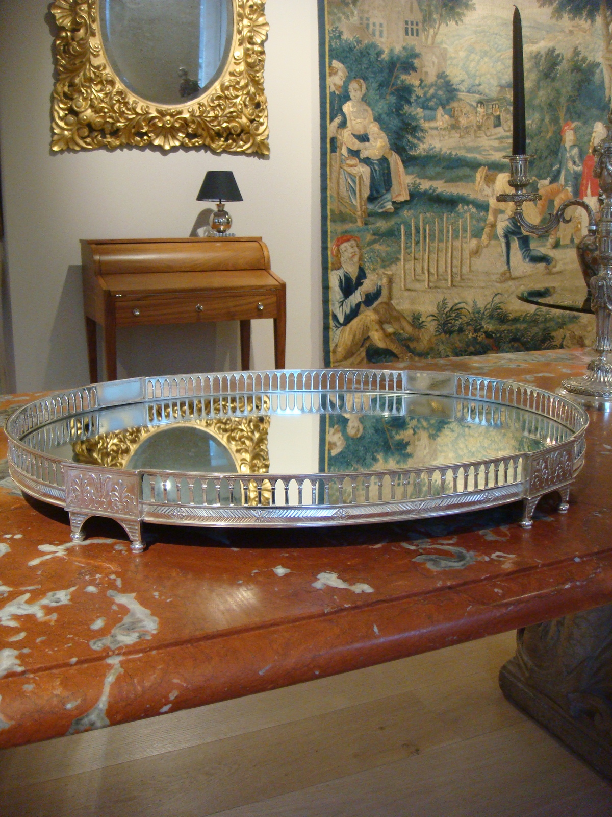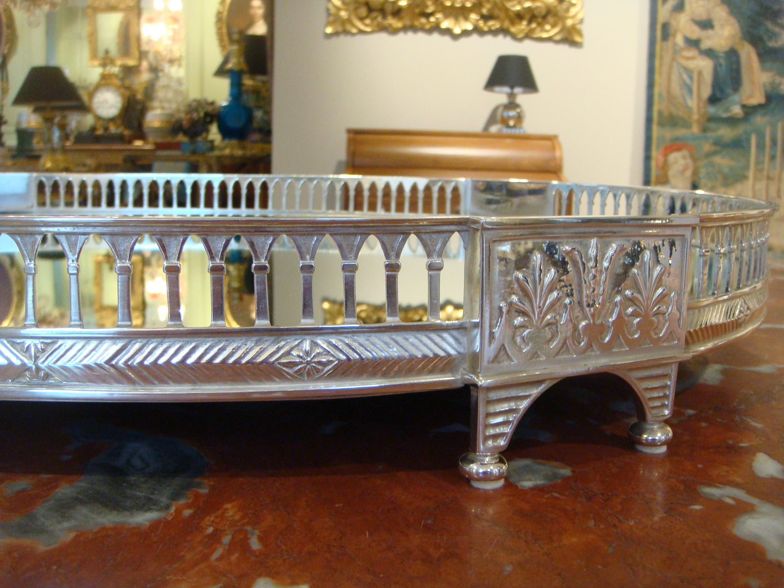 Surtout de table de forme ovale en bronze argenté à décor d’une galerie ajourée à balustres , soutenu par huit pieds réunis par des carrés à décor de palmettes. Le fond de miroir est posé sur un parquet de bois de chêne . Objet en parfait état d’époque XIX ème Siècle.