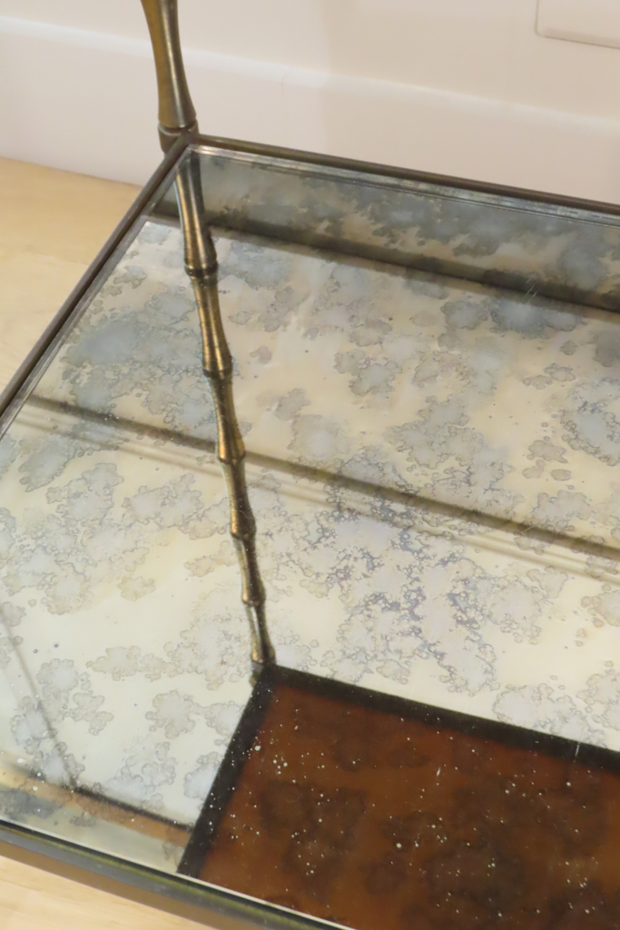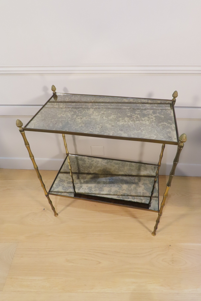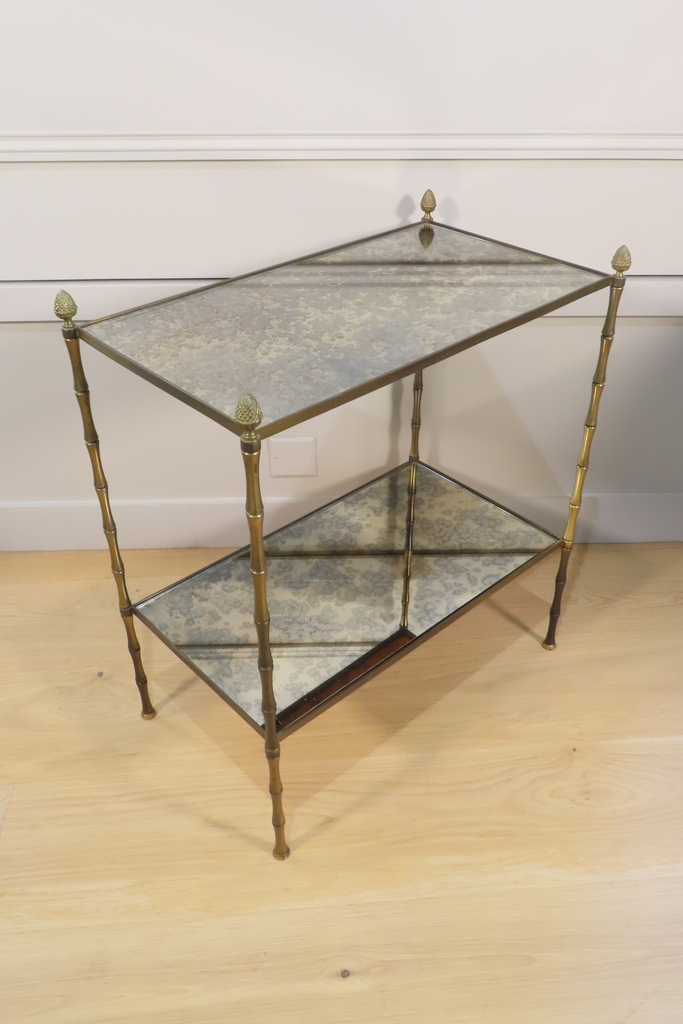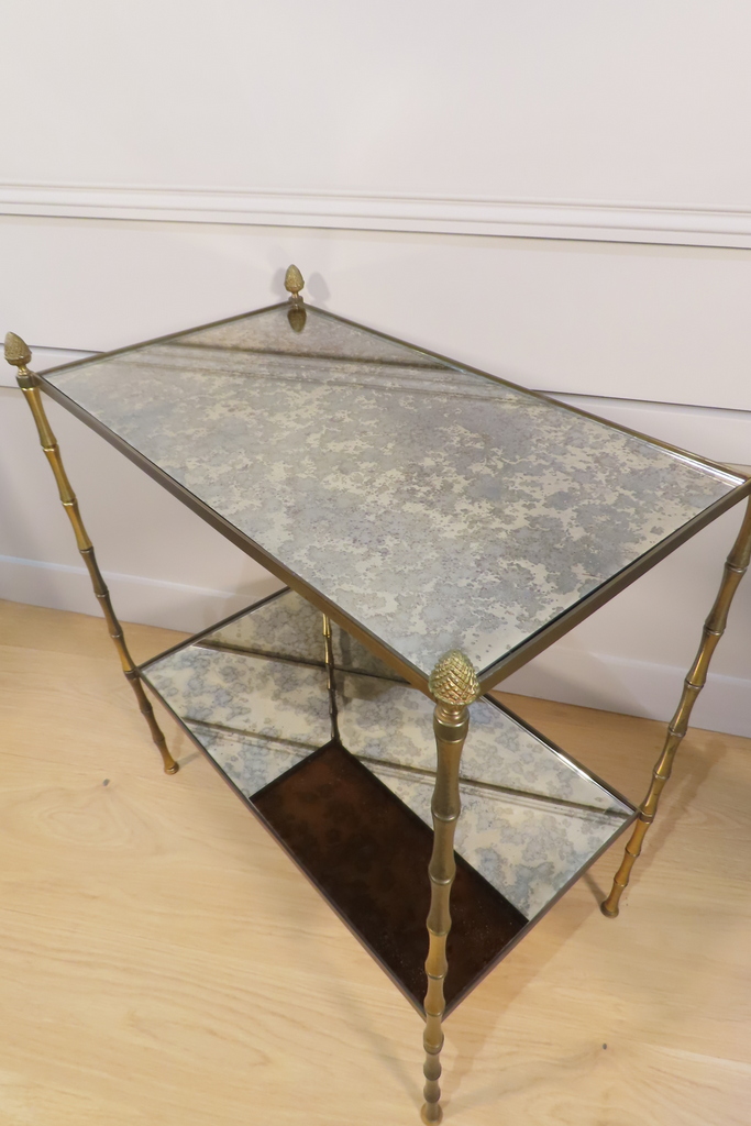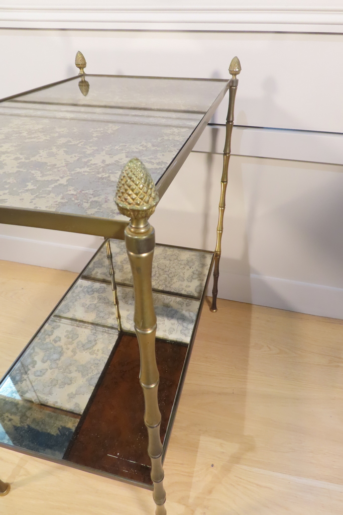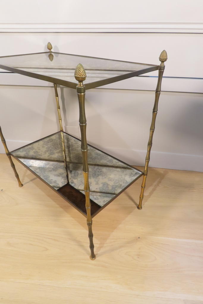 Table rectangulaire, bout de canapé à deux plateaux en miroirs moiré piqueté, à monture de laiton et bronze, simulant de tiges de bambou terminées par des pommes de pins. Joli travail vers 1970 attribuable à la maison Bagues.