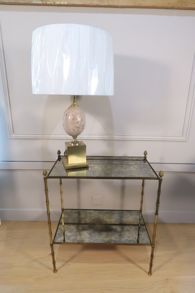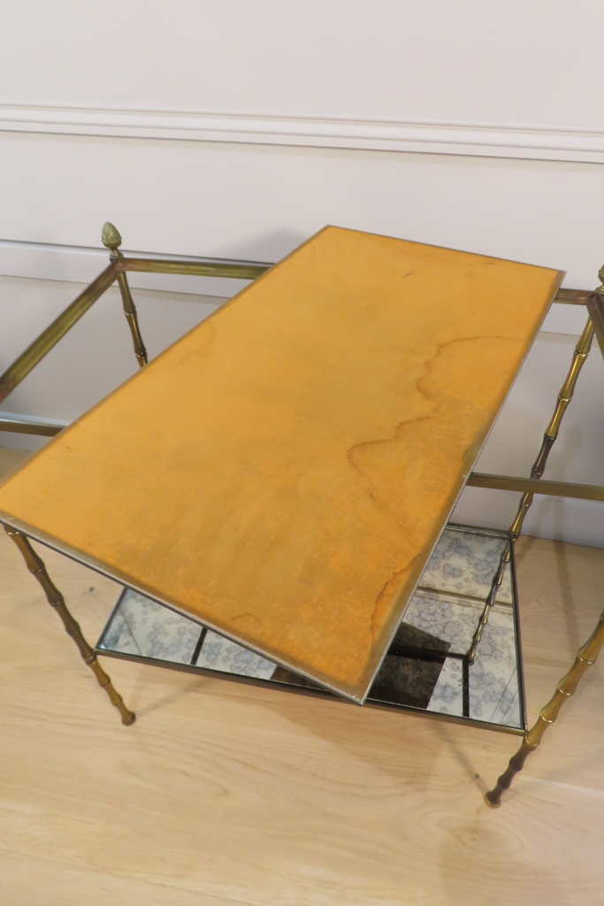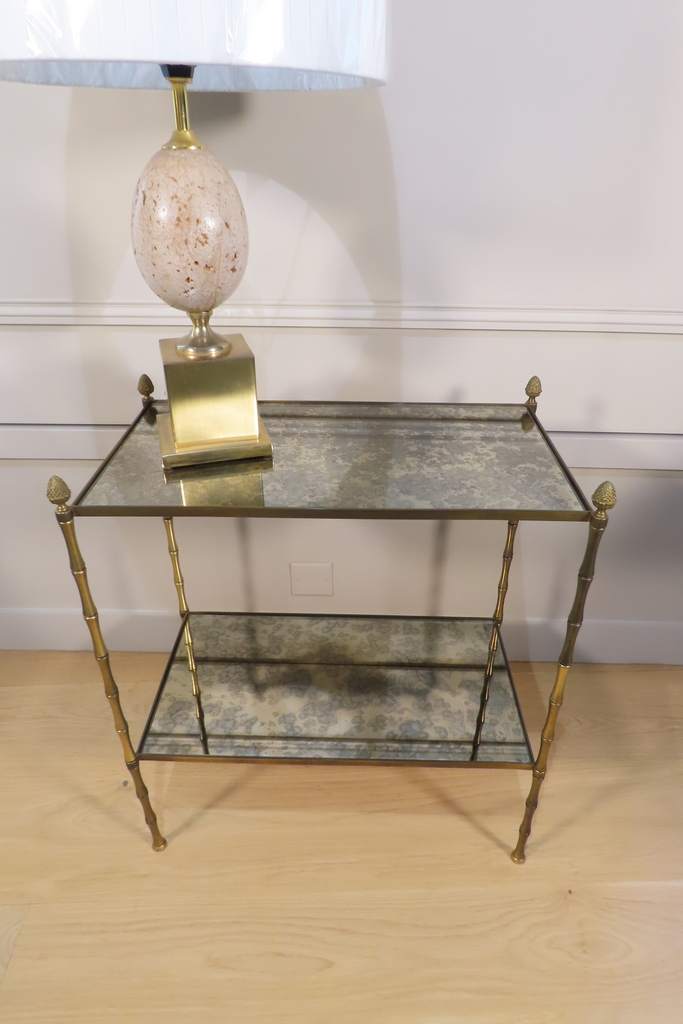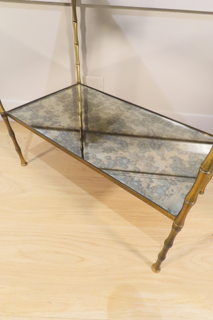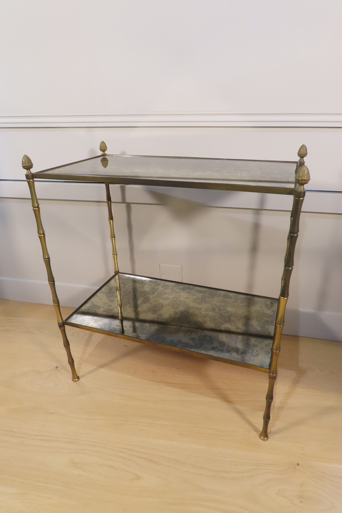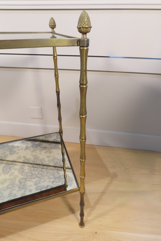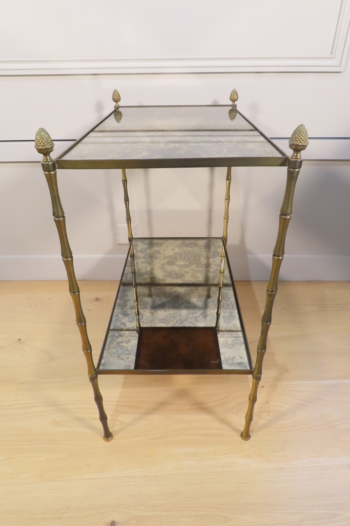 Table rectangulaire, bout de canapé à deux plateaux en miroirs moiré piqueté, à monture de laiton et bronze, simulant de tiges de bambou terminées par des pommes de pins. Joli travail vers 1970 attribuable à la maison Bagues.