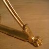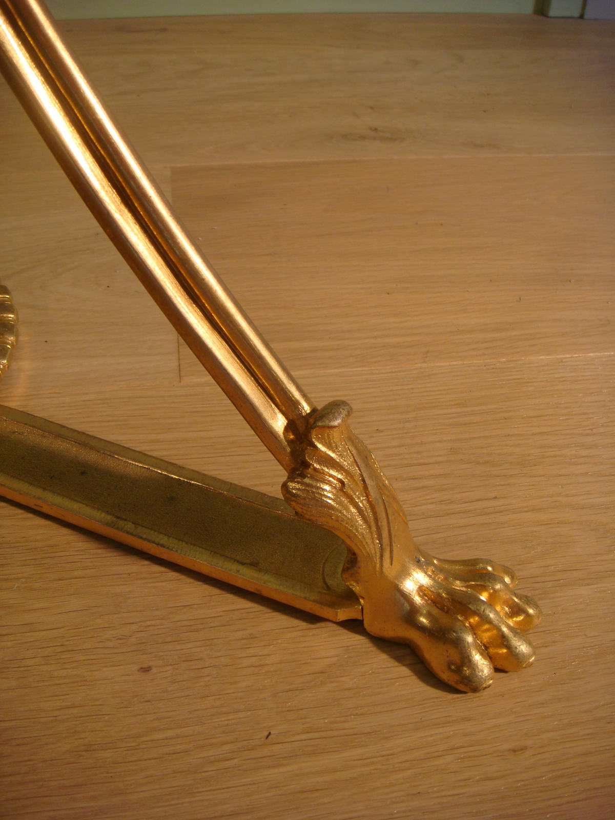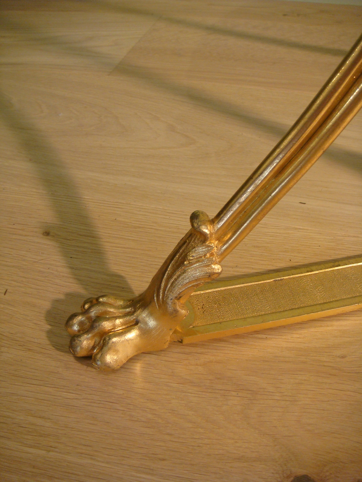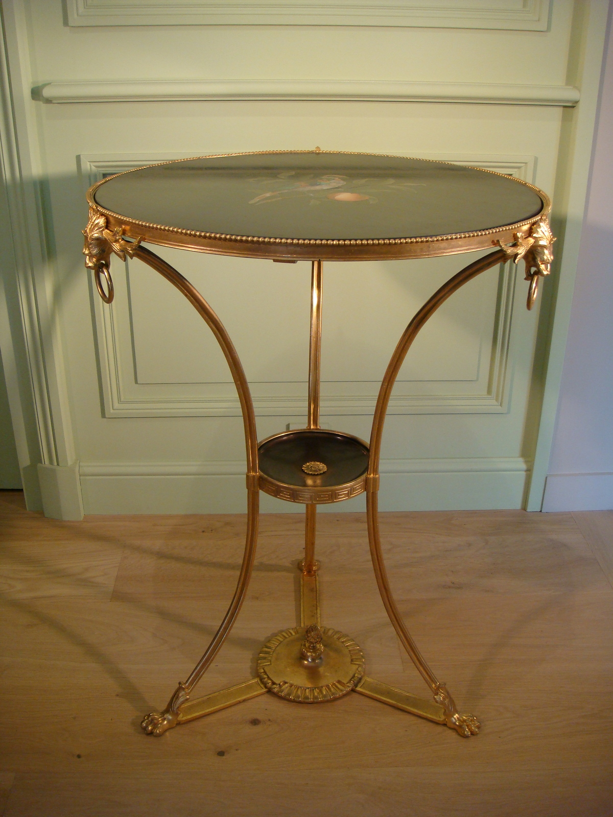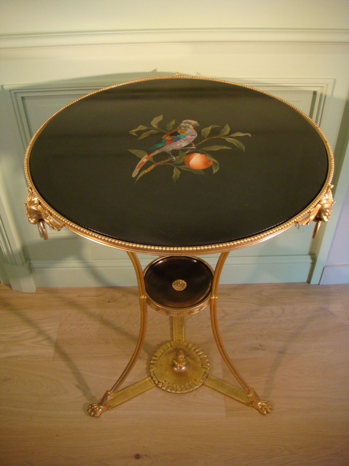 Table guéridon en bronze ciselé et doré à riche décor de têtes de lion feuillagé tenant un anneau dans leur gueule, pieds griffes réunis par un médaillon godronné agrémenté par une pomme de pin. Petit plateau d’entre jambe à patine brune cerclé d’une grecque. Ce guéridon est coiffé d’un marbre noir à marqueterie de pierre dure représentant un oiseau sur une branche d’arbre fruitier . Ce guéridon porte une étiquette en dessous de la maison Lassalle & Cie à Paris . Meuble en bel état, présence d’une légère usure en pourtour de la base centrale.