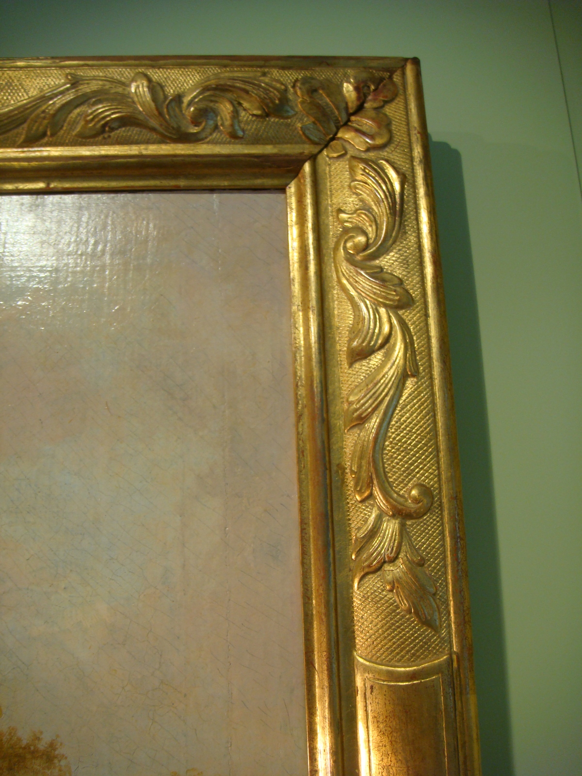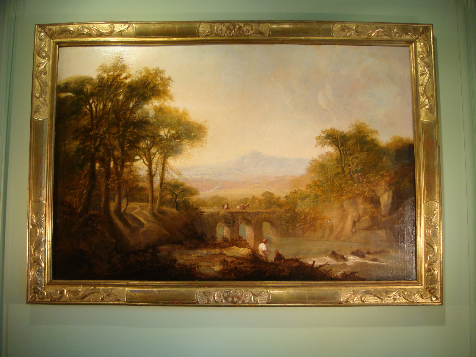 Grand tableau, huile sur toile représentant des personnages dans un paysage arboré, bord de rivière et pont en premier plan, montagne en arrière plan. Ce tableau est présenté dans un cadre en bois sculpté et doré d’époque postérieur ( avec quelques manques et reprises ) Il a été nettoyé. Châssis d’origine portant l’annotation peint en 1830 par Anthony Vandye Copley-Fielding, peintre Anglais de 1787 à 1855.