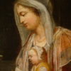 Tableau, huile sur toile représentant un intérieur avec en premier plan une jeune femme et son enfant jouant avec un petit chien, berceau en osier tressé sur le coté et de l’autre une petite panière avec des habits. En arrière plan une table avec une nappe sur laquelle est disposé un pichet en grès émaillé et un bol. Ce tableau a été anciennement ré entoilé, il est en bel état, nettoyé et revernis. Tableau Hollandais du XVIII ème Siècle. Il est présenté dans un cadre en bois mouluré et ondé d’époque postérieur, XX ème Siècle.