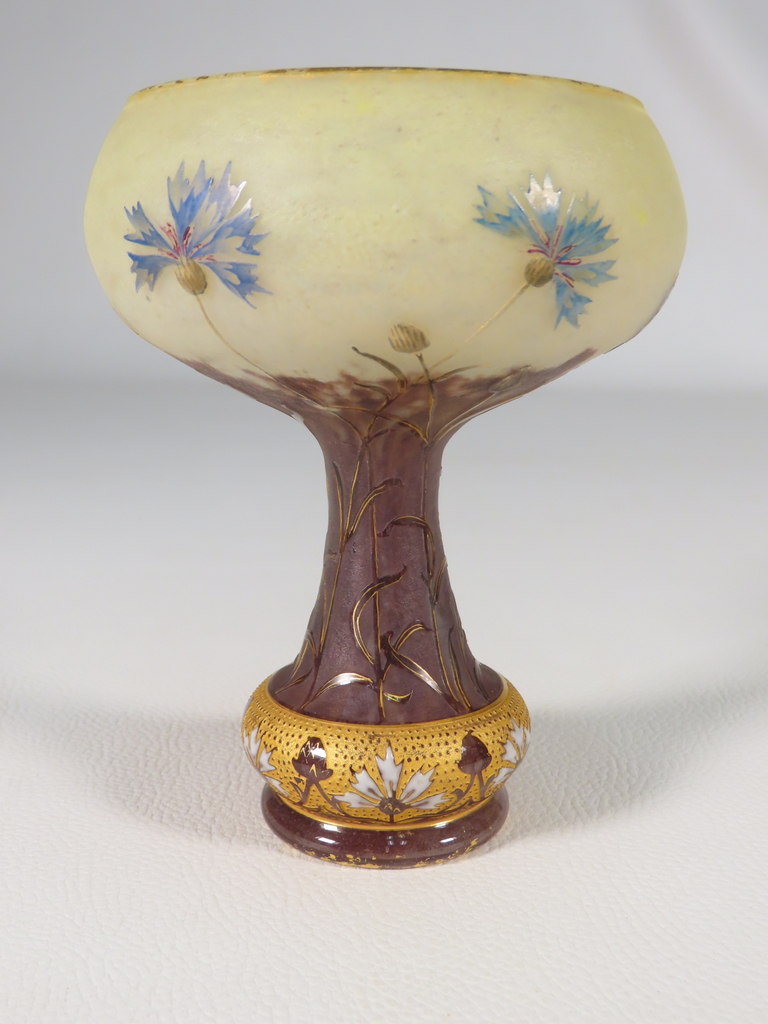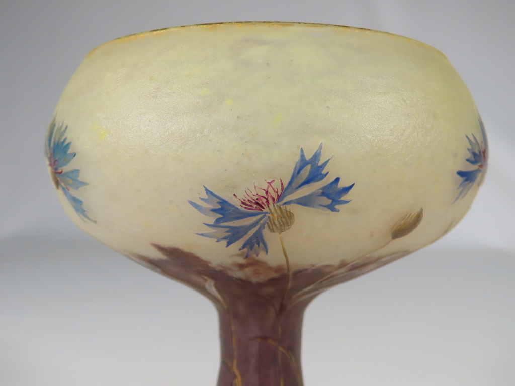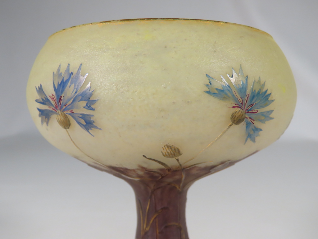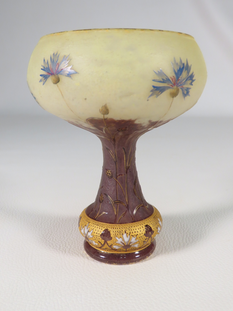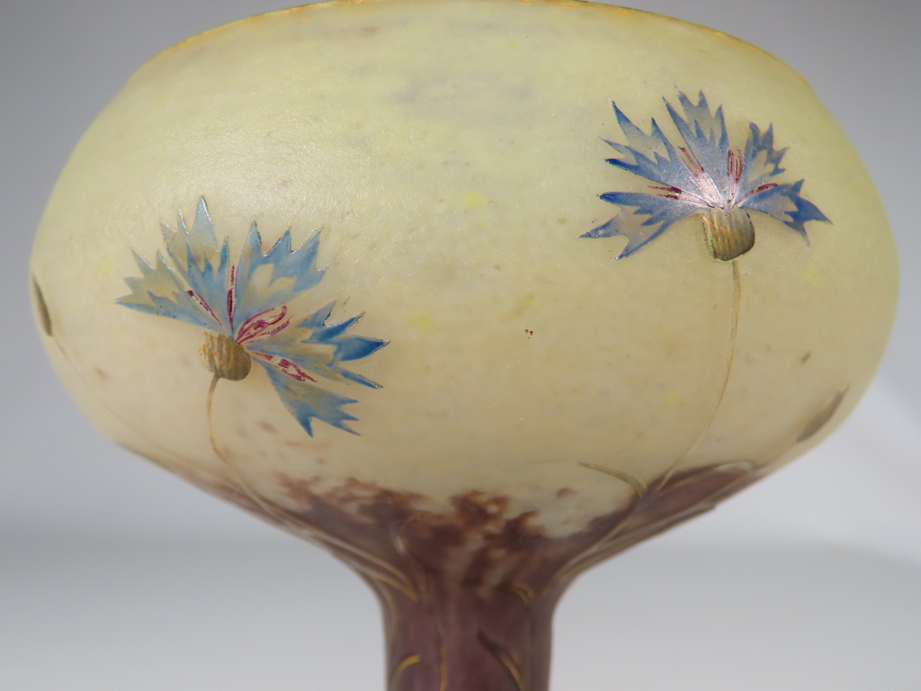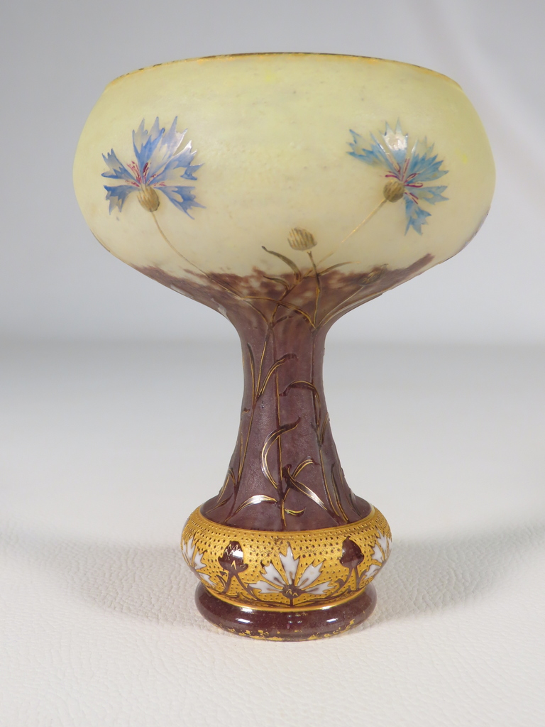 Vase en forme de coupe en verre multicouche dégagée à l’acide à décor floral de bleuets sur une base renflée à bleuets stylisés émaillés l’ensemble rehaussé à l’or. Présence de la signature en dessous Daum Nancy à la Croix de Loraine. Ce vase est en parfait état. Présence d’une légère usure de la dorure en pourtour du col et du pied. Vase d’époque vers 1900