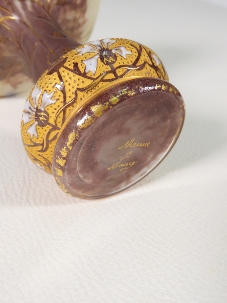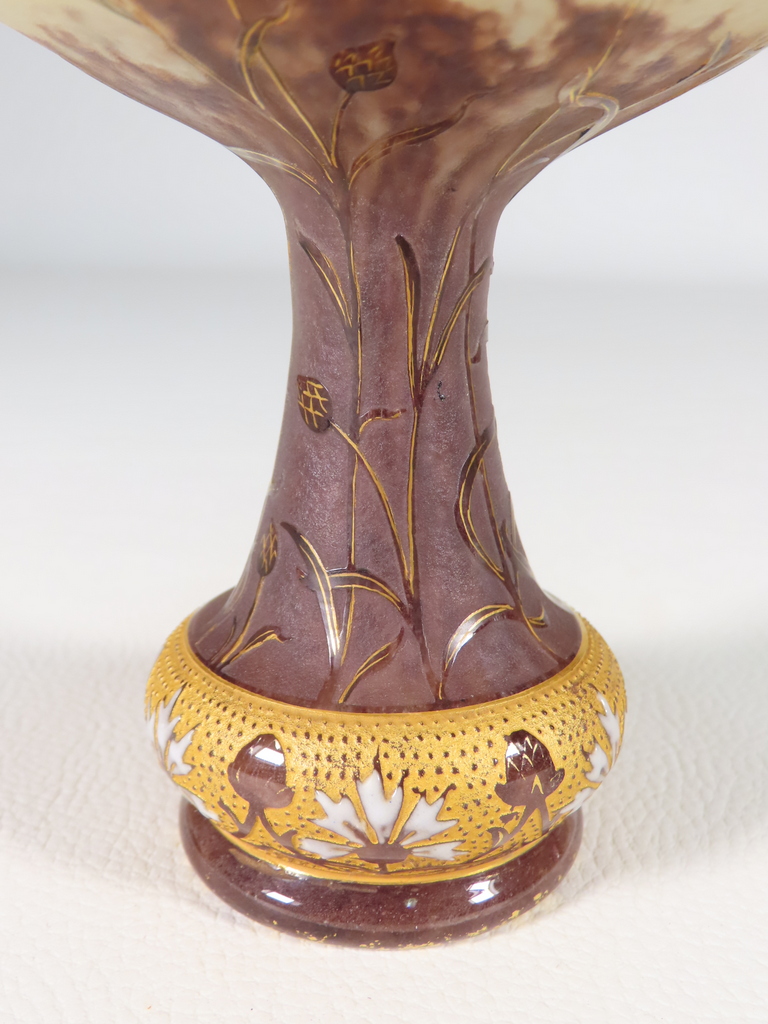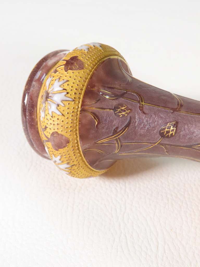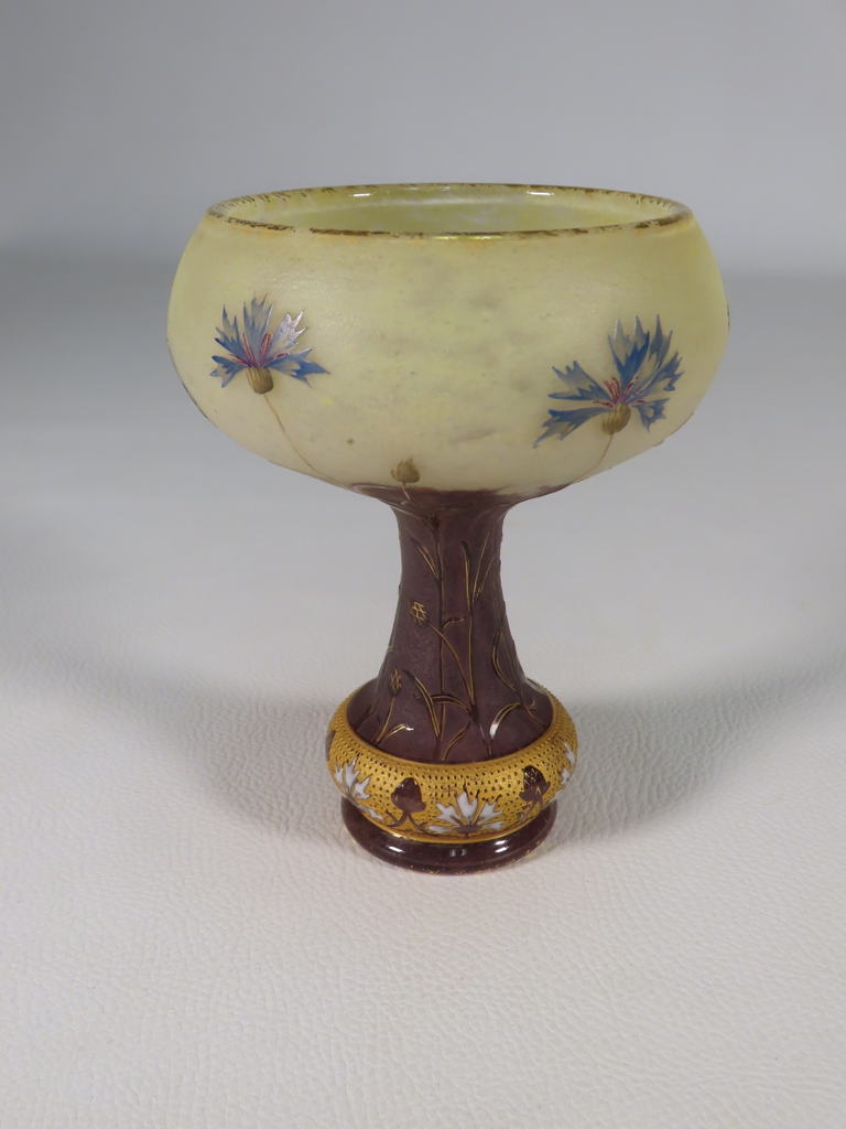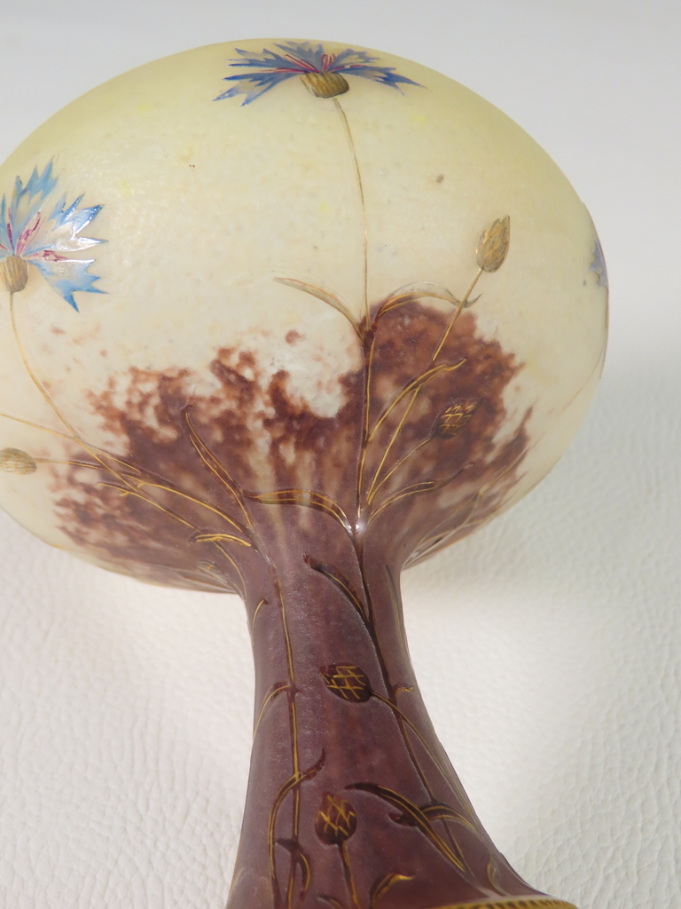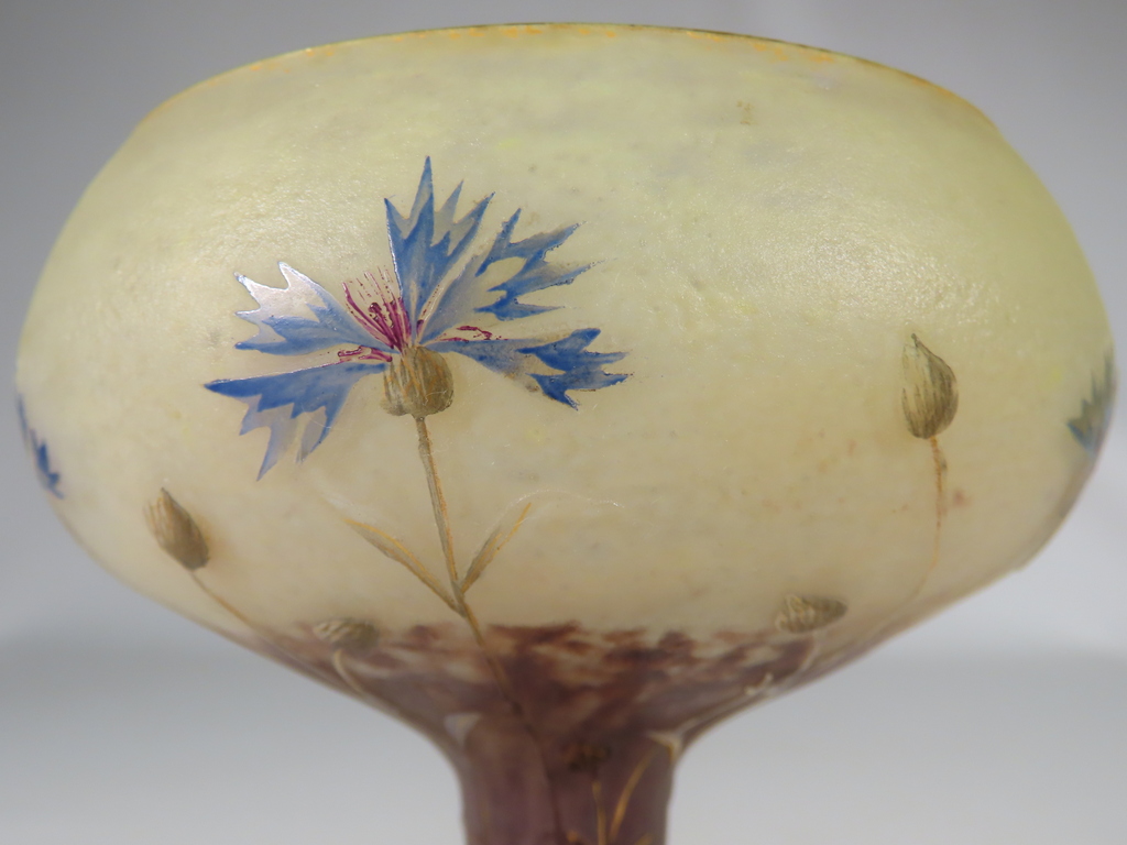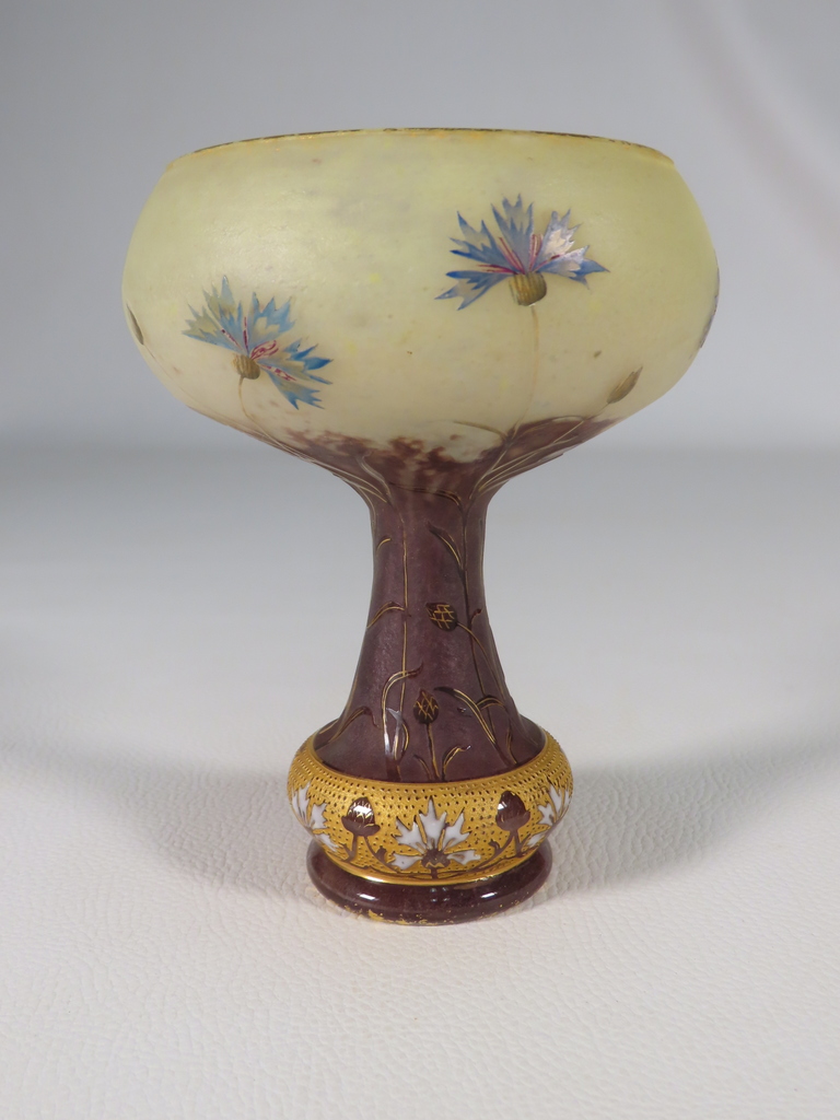 Vase en forme de coupe en verre multicouche dégagée à l’acide à décor floral de bleuets sur une base renflée à bleuets stylisés émaillés l’ensemble rehaussé à l’or. Présence de la signature en dessous Daum Nancy à la Croix de Loraine. Ce vase est en parfait état. Présence d’une légère usure de la dorure en pourtour du col et du pied. Vase d’époque vers 1900