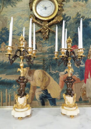 PAIRE DE CANDELABRES AUX AMOURS ET PANIERS FLEURIS