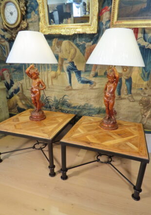 PAIRE DE LAMPES AUX AMOURS EN BOIS SCULPTE